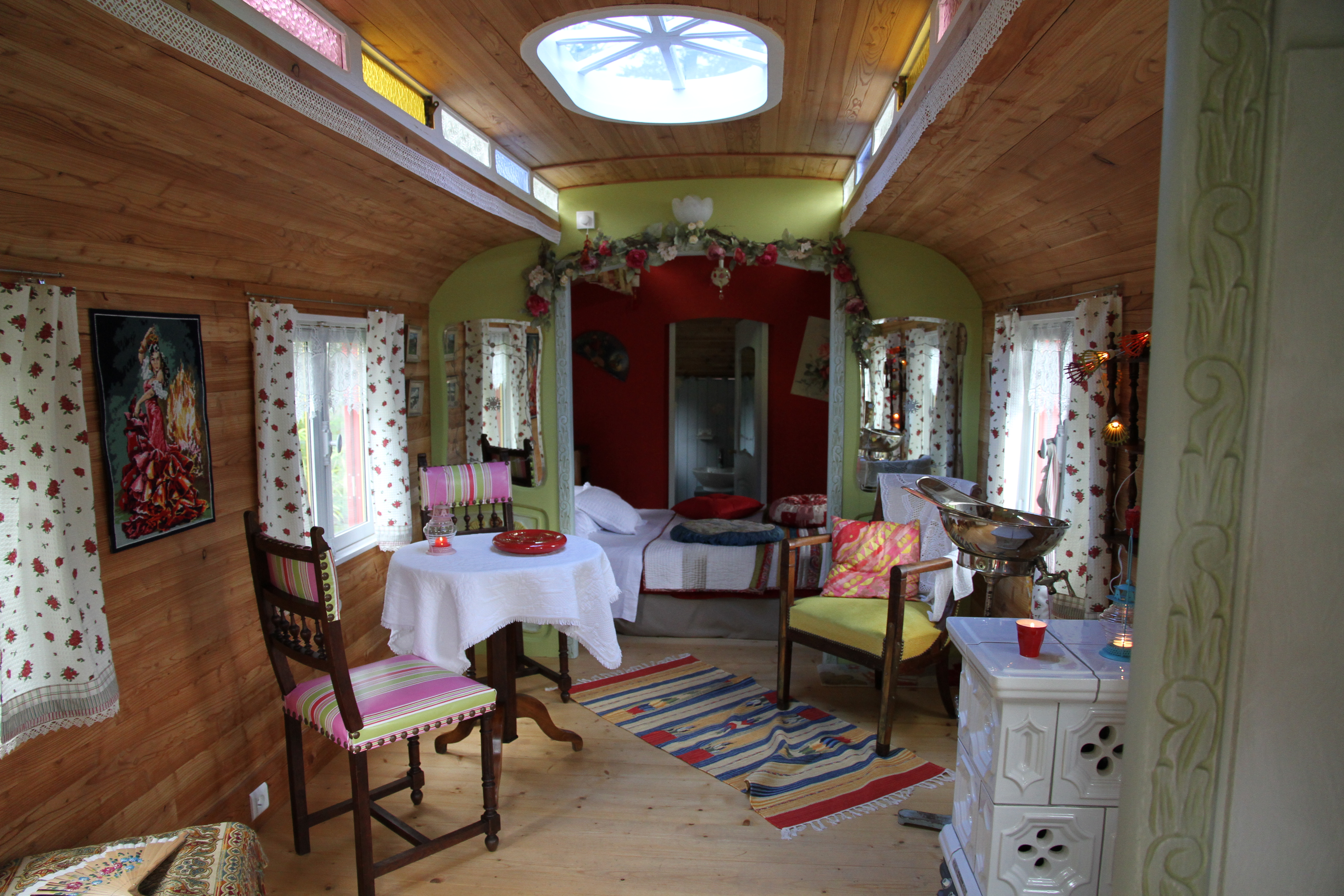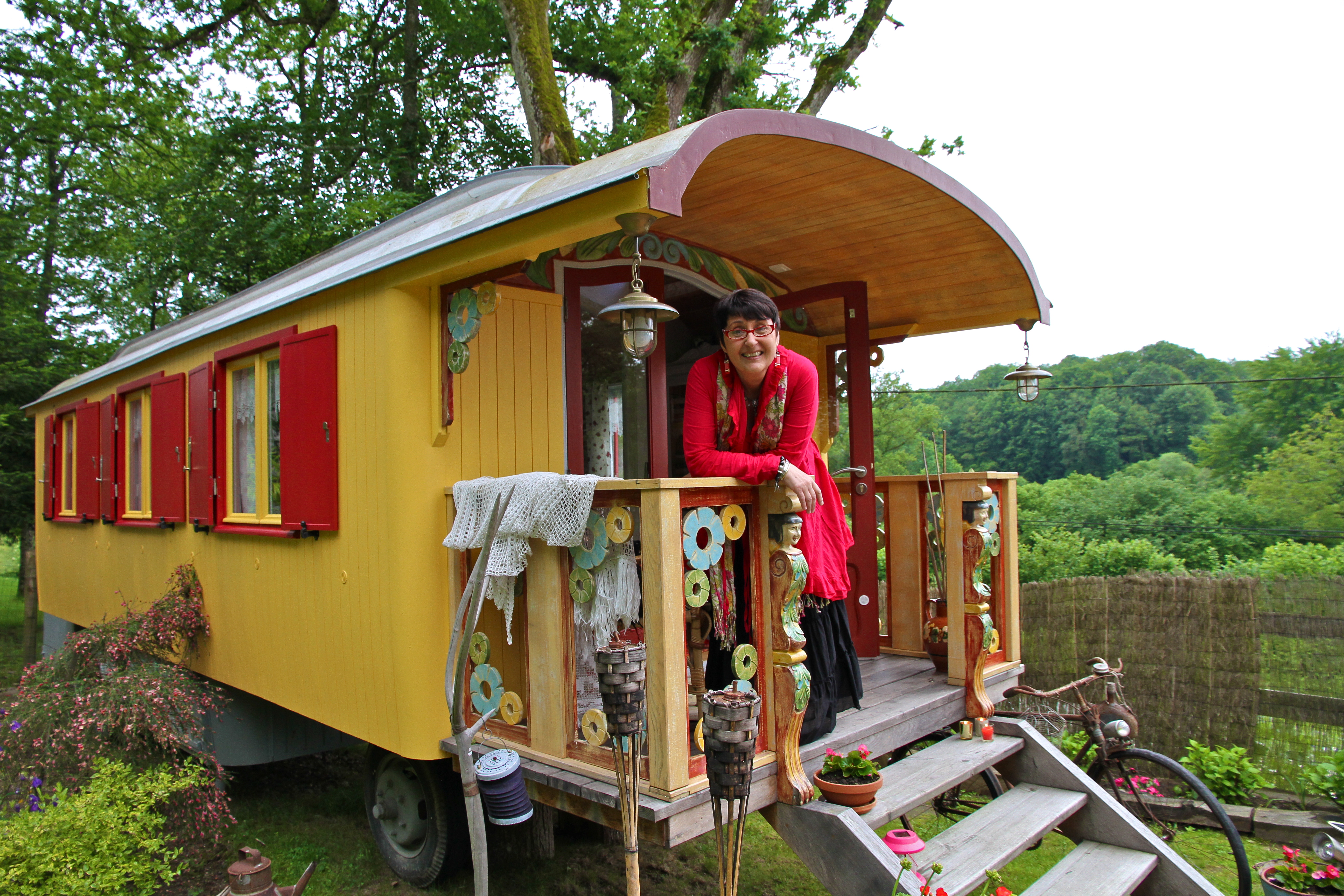 Etwas weiter nördlich, nahe der Renaissance-Stadt Aubusson, liegt ganz versteckt das ungewöhnliche Hotel „Chambres d’Hotes en roulotte“ von Madame Maryvonne Janex-Lefort. In dem kleinen Garten hinter ihrem urigen Blockhaus mit dem Margariten bewachsenen Dach hat die lustige Französin seit 2009 einen knatschgelben, echten Zigeunerwagen mit roten Fensterladen stehen. Durch die niedrige Tür treten wir in eine andere Welt: Original Spitze an den Fenstern, ein weißer Kachelofen und ein voller Bücherschrank laden zum gemütlichen Teetrinken ein. „Ich bin so verliebt in meinen Wagen aus den Pyrenäen, da kann nur einer aus meiner Familie Zigeuner gewesen sein“, sagt die charmante Madame und lacht.