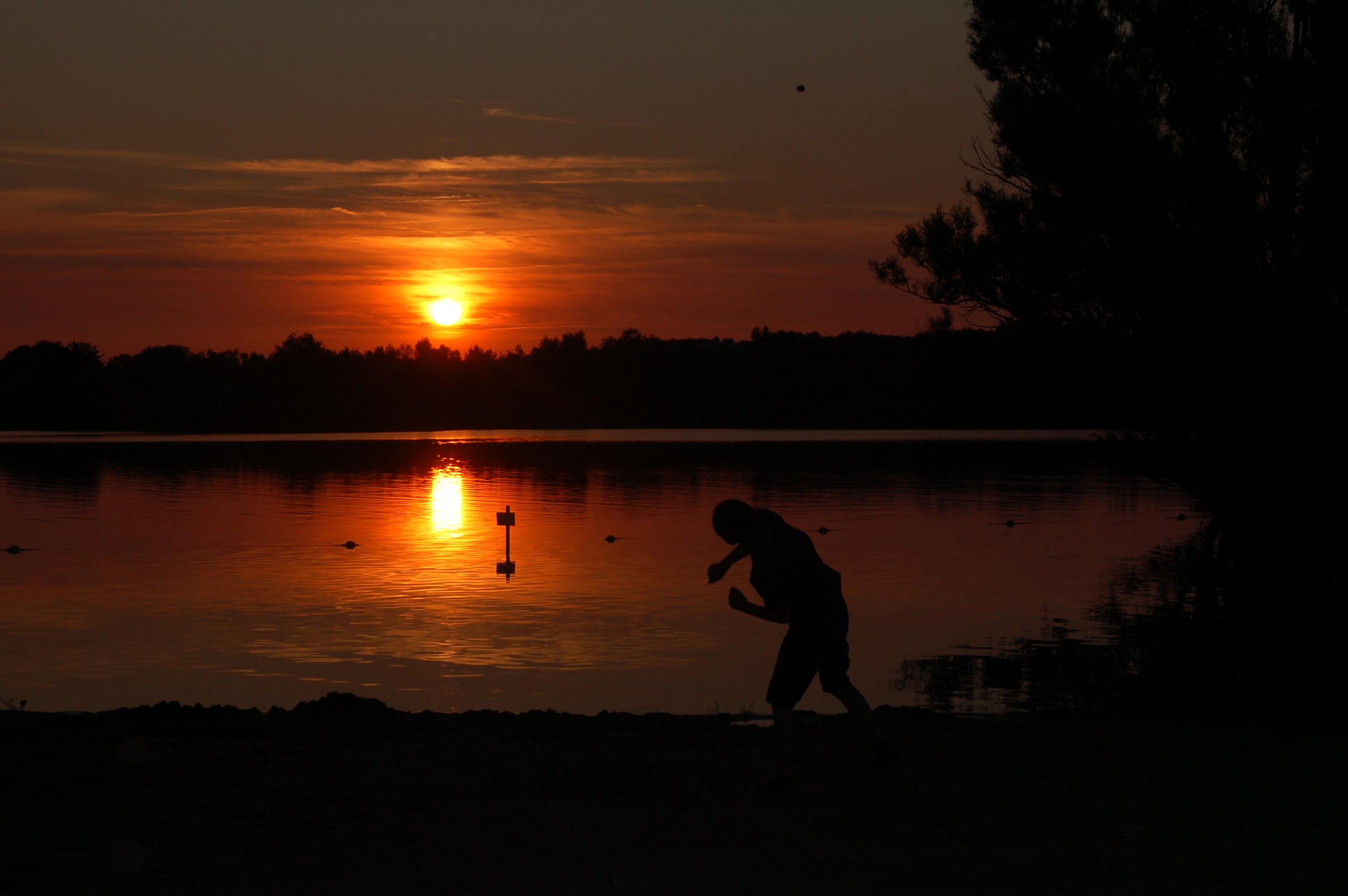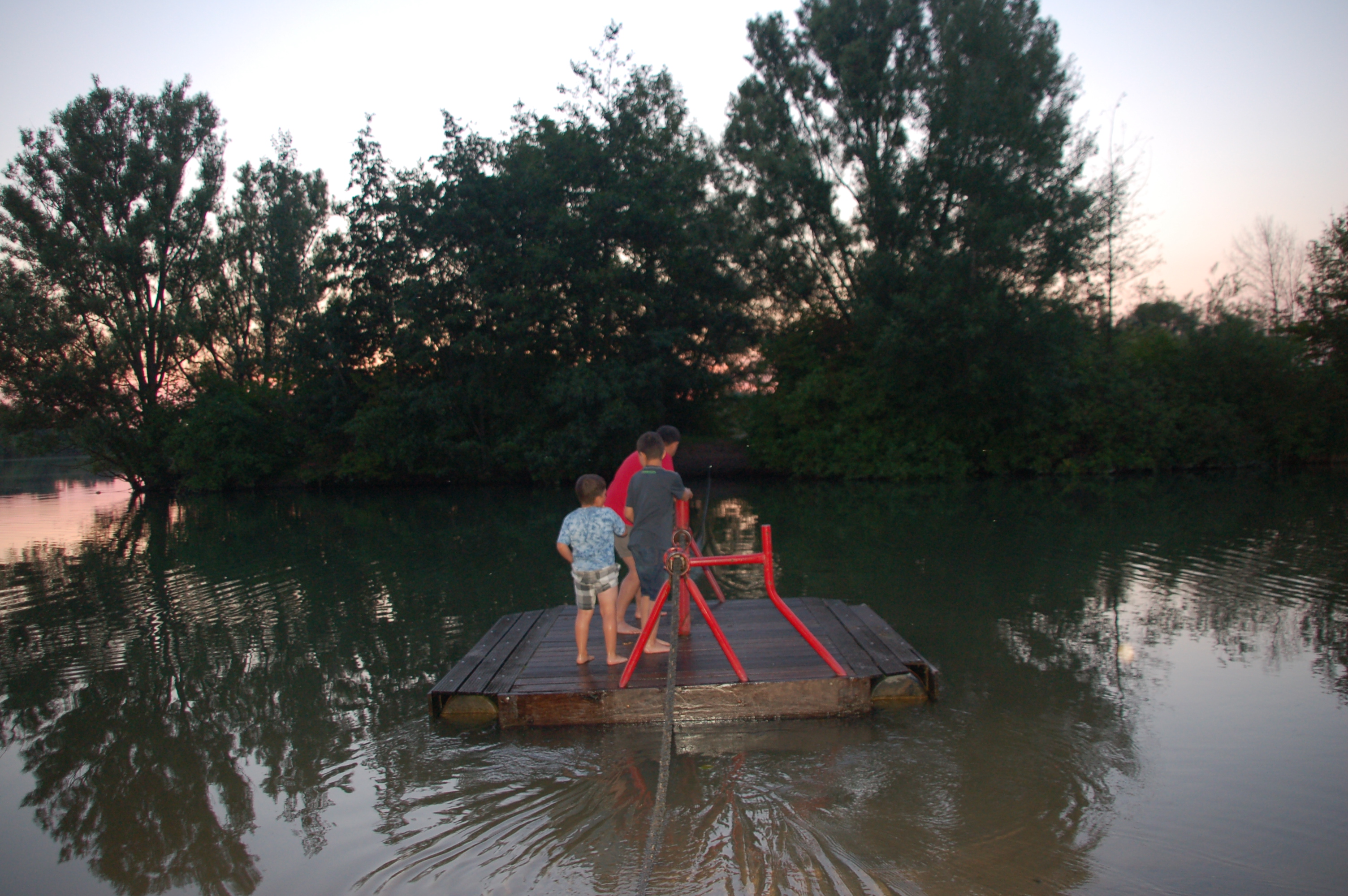 Auf der Insel haben die Kinder Reste der Schale von Enteneiern gefunden, ein verlassenes, riesiges Schwanenei, und am Inselufer flitzten Stichlinge durch das Wasser: 15 schreiende Kinder auf dem Floß: „Da, daaaaa sind welche.“ Und zwei mit Käscher bewaffnete Spielkameraden, die versuchen, einen zu fangen. Ins Netz geht nie ein Fisch, aber Spaß macht es trotzdem. Und am schönsten ist es in den Abendstunden, wenn sich der Strand leert, die Froschkonzerte beginnen. Plötzlich ein leises „plitsch, plitsch“ von der flachen Uferzone: fast durchsichtige, winzige Babyfische springen aus dem Wasser, versuchen, Mücken zu fangen. Eine Entenfamilie hat es sich auf dem Floß gemütlich gemacht. Sonnenuntergang am See…