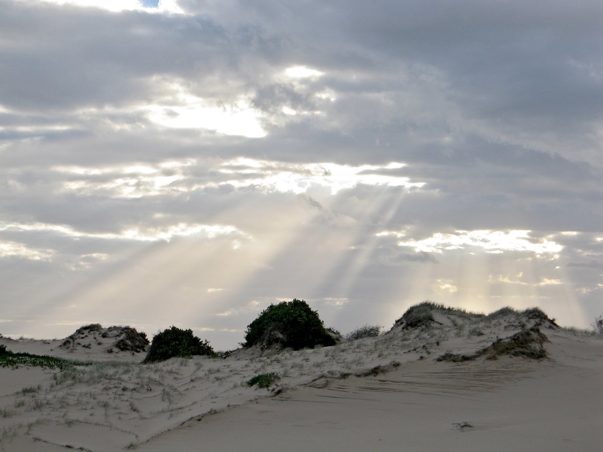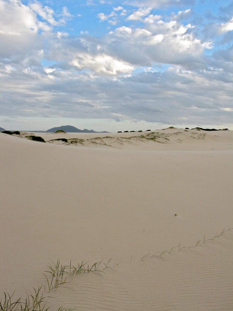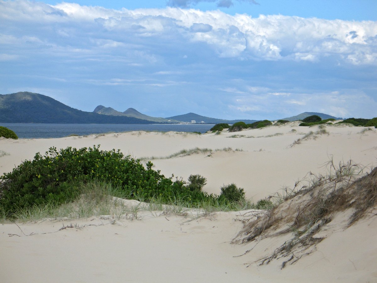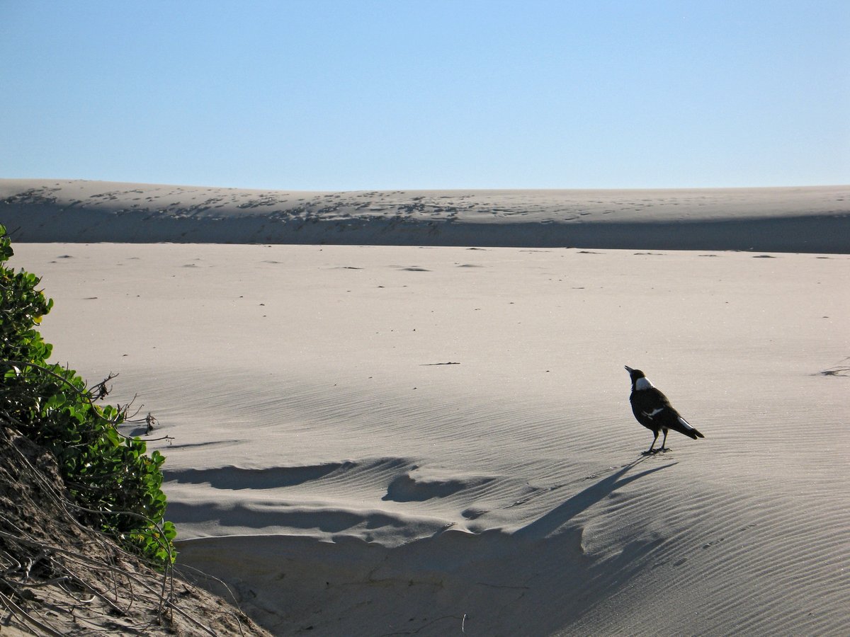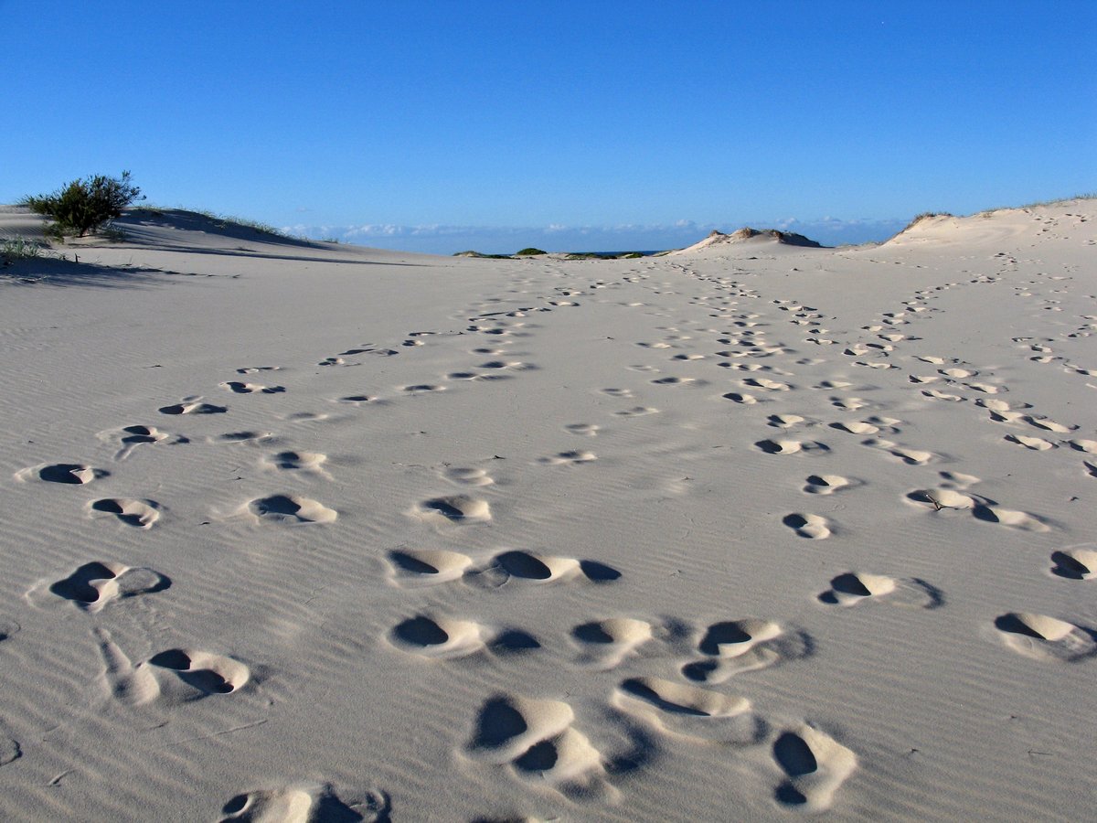 Sand, Sand, Sand – und dann ein weiter Blick aufs Meer. Nur drei Autostunden nördlich von Sydney liegt einer der schönsten Nationalparks an Australiens Ostküste, die ich besucht habe: Myall Lakes. Stundenlanges Stapfen durch die Dünen, unter einem Himmel mit ständig wechselnden Wolkenwelten – himmlisch! Benannt ist der Park nach mehreren Lagunen – den Myall Lakes – die hinter dem 40 Kilometer langen Sandstrand zwischen den Dünen eingebettet sind. Übernachten lässt sich im Schatten alter Eukalyptusbäume und grünen Palmwalds – Nachbarn sind die Warane auf den dicken Ästen, Vögel im Laub und allerlei kleine Krabbeltiere, die im Sand ihre Spuren hinterlassen… Wer die Natur sucht, die Einsamkeit schätzt, ist hier richtig. Nette Kontakte an Zelt oder Strand inklusive.