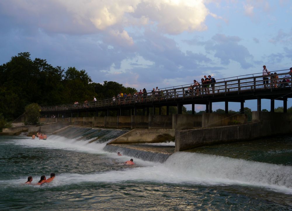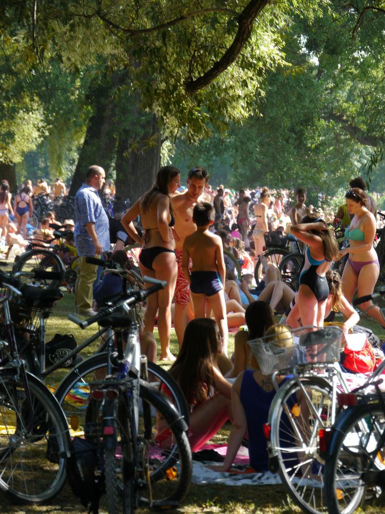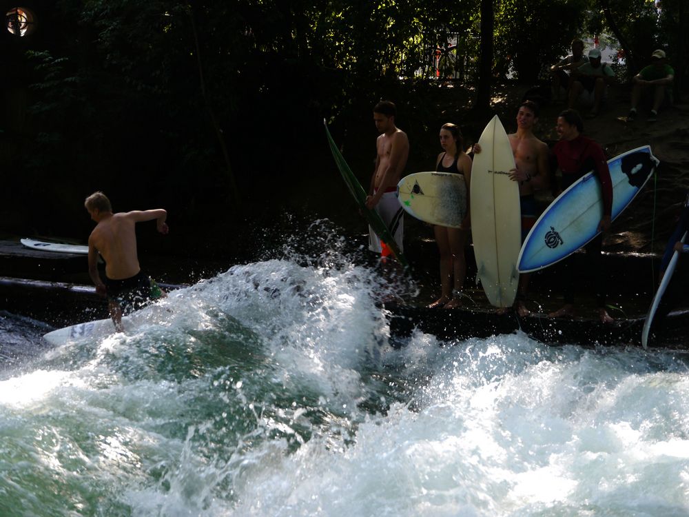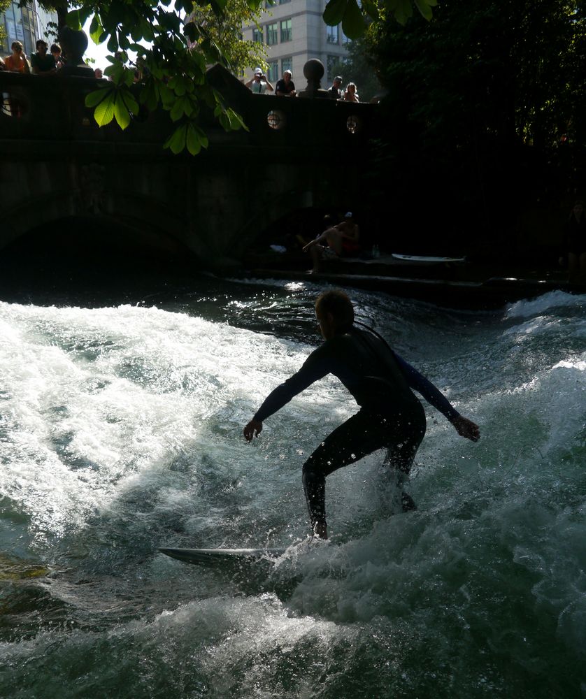 Zum Glück gibt’s in München eine Menge davon. Viele Brunnen, den Eisbach oder auch die Isar. Der Englische Garten ist zurzeit gerappelt voll, die Menschen zieht’s ins Nass, sogar da, wo das Baden eigentlich ausdrücklich verboten ist 😉 Und richtig heiß-kalt wird’s an der „Welle am Eisbach„, wo sich Surfer auf den spritzenden Strom wagen, während das Publikum oben auf der Brücke steht.