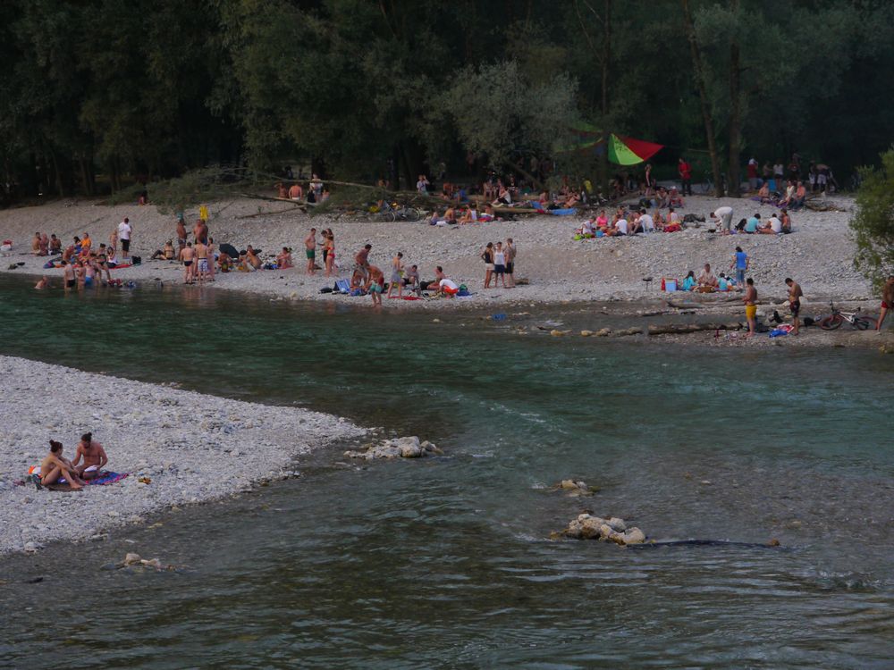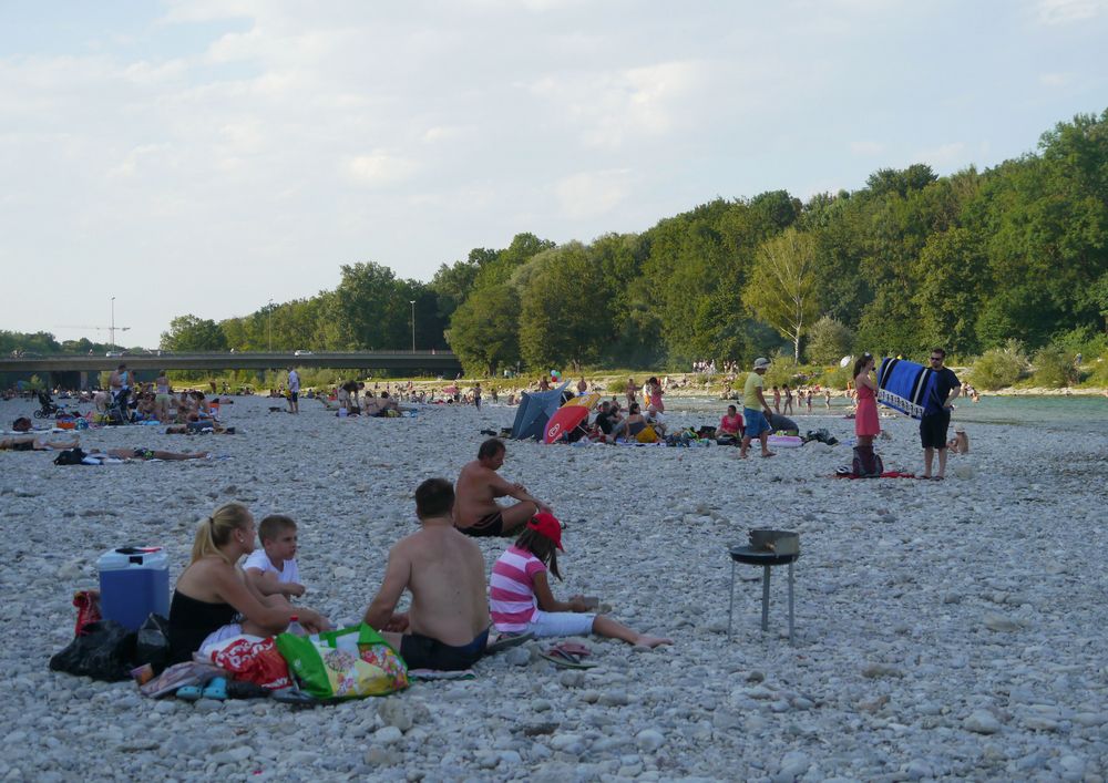 Bissl mehr Platz ist am Flaucher, an der Isar, aber auch da sind die Kieselstrände gesteckt voll. Aber ein kühles Bade-Eckchen findet sich am Ende immer…