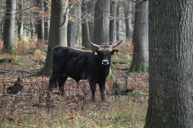 Am Gatter zum Hutewald bei Nienover empfängt uns Frank Grajewski. Er kümmert sich um die Tiere, die das ganze Jahr über hier draußen leben. Sie ernähren sich von Eicheln, Bucheckern, Zweigen und allem, was der Wald ihnen bietet. „Im Sommer verstecken sie sich im Farnkraut. Das schützt sie vor Mücken und anderen Insekten“, erklärt mir Frank Grajewski. Deshalb kann man sie jetzt, wo keine Blätter an den Büschen und Bäumen sind und die Farne trocken, auch am besten beobachten. Misstrauisch beäugen uns die Auerochsen von weitem.