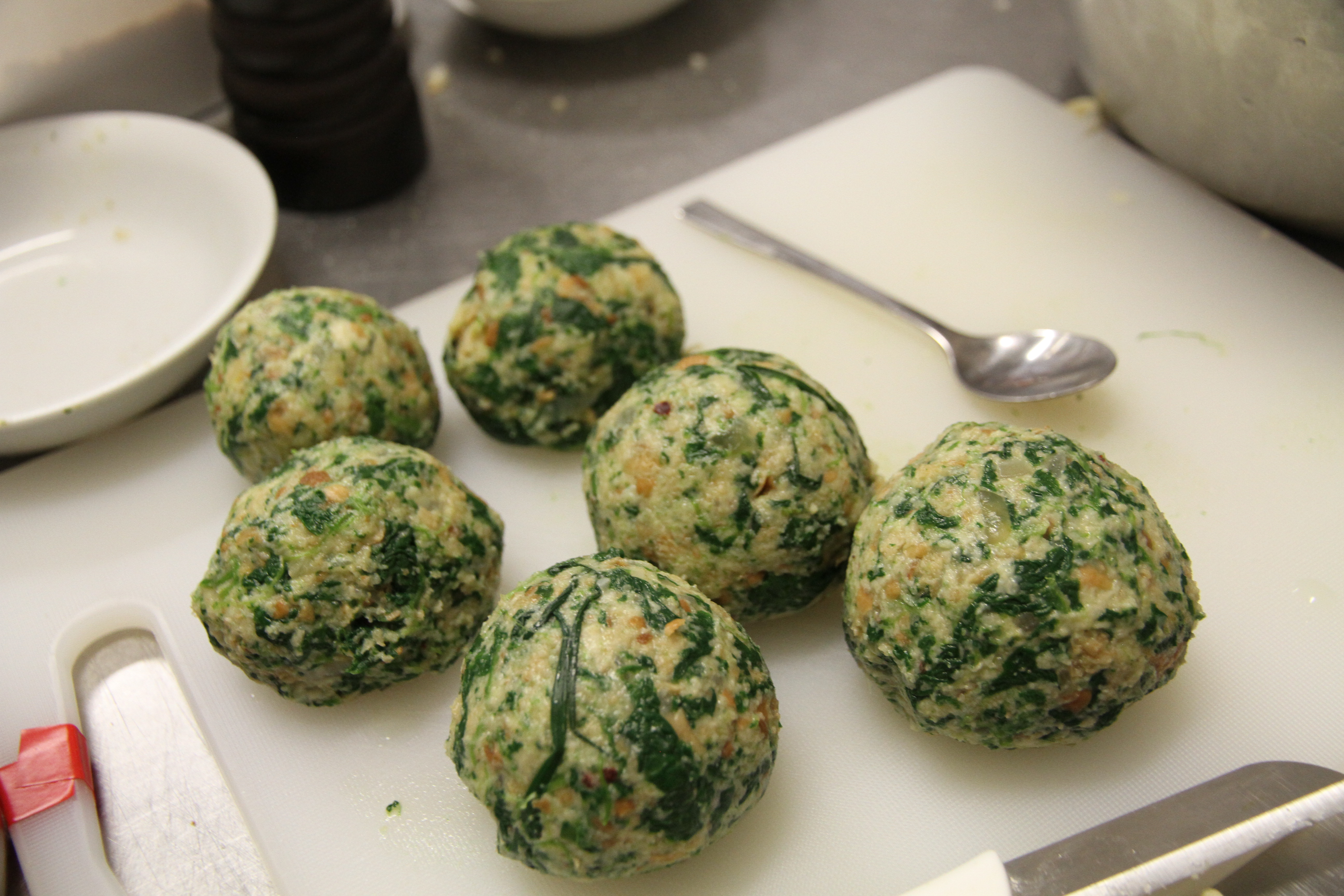 IMG_7736Hier lebt und arbeitet die Knödelmeisterin – Michaela Schmitz-Guggenbichler – in grün-rotem Bauerndirndl mit tiefem Ausschnitt. „Knödel hab‘ ich schon immer für mein Leben gern gekocht“, erklärt sie mir. Sie lacht herzlich, gern und häufig, eine wahre bayrische Frohnatur! Trotz einem Haufen Gäste in der zünftigen Wirtsstube und zig qualmender, wartender Teller in der Küche ist sie voll entspannt, eben gut drauf – Ich wär‘ voll hektisch hinterm Herd rumgeturnt und schon längst in die Wirtsstube gerannt.IMG_7717 Doch sie steht relaxt am Küchentisch und erzählt von ihren Spezialitäten: Weißbierknödel, gebratene Kasknödel und die leckere Spinatvariante. Doch das Beste: Bei ihr können Hobbyköche seit acht Jahren lernen, wie man das althergebrachte Reste-Essen aus dem Alpenraum selbst macht. Michaela ist im Süden weit und breit die Einzige, die Knödelkurse anbietet. Heute bin ich mit ein paar Kollegen dran: Schürze an, Haare zusammenbinden, Schmuck ab. Foto 2Zunächst heißt es: den Teig bearbeiten. „Gut mit der Hand durchmischen und würzen – und dann das Ganze ein bisschen ziehen lassen“, verrät die 39-Jährige ein paar Tipps, wie gute Knödel gelingen. Dann ordentlich Mehl in die Hände klatschen. Und schon wird der Teig in Kugeln geformt, so gut es eben geht – meine sehen eher aus wie unschöne Eier, auch viel zu klein …Egal. Und dann geht’s ab damit ins kochende Wasser.