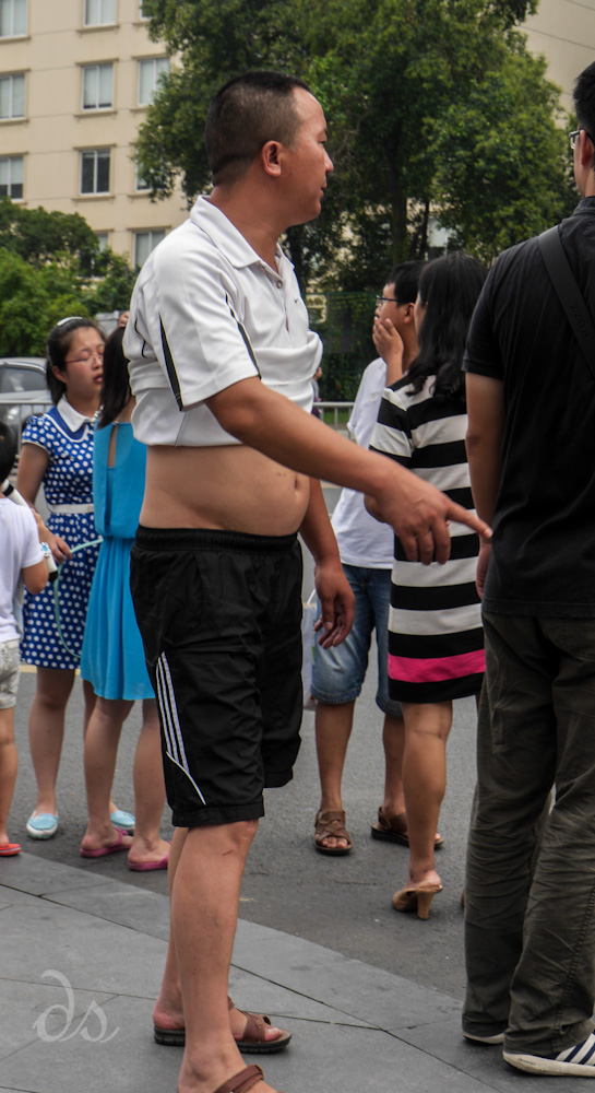 Ob Asiaten wirklich weniger schwitzen als Europäer? Keine Ahnung! (*) Ich weiß nur, dass aktuell die heißesten Wochen des Jahres begonnen haben. Dass also die 35°C-plus-Temperaturen sogar den Norden – sprich Peking – erreicht haben… Die Kaiser früher (und wer Zeit und Geld hat, heute) flüchtet(en) in die kühleren Berge. Dort stehen noch heute die Sommerpaläste. Und wer in der Stadt bleibt? Macht Folgendes: Baden gehen! Oder im Schatten stehen und Angeln. Gern auch mitten in Peking, vorausgesetzt das Wasser ist sauber genug (immerhin blüht hier Lotos!) – die nahe Ringstraße stört da offenbar wenig…