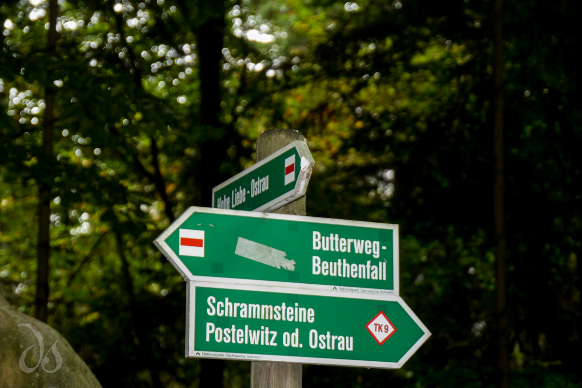 Also los geht’s, aus dem Kirnitzschtal vom herrlich verwitterten Parkplatzschild rein in den Wald, in den Nationalpark Sächsische Schweiz, Richtung Schrammsteine (die angeblich ihren Namen aus dem Mittelalter haben, von „schramen“, aufreißen – war offenbar schon damals ziemlich zerrissen und zerklüftet, die Felslandschaft hier):