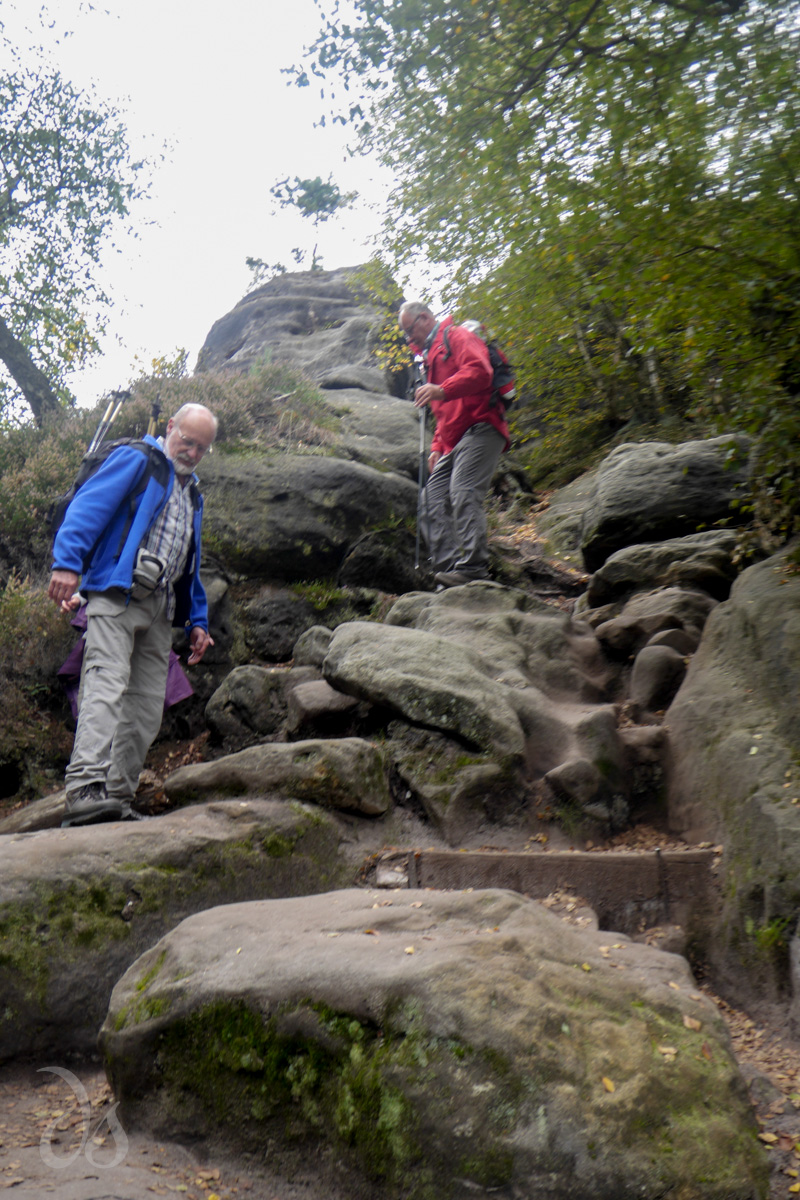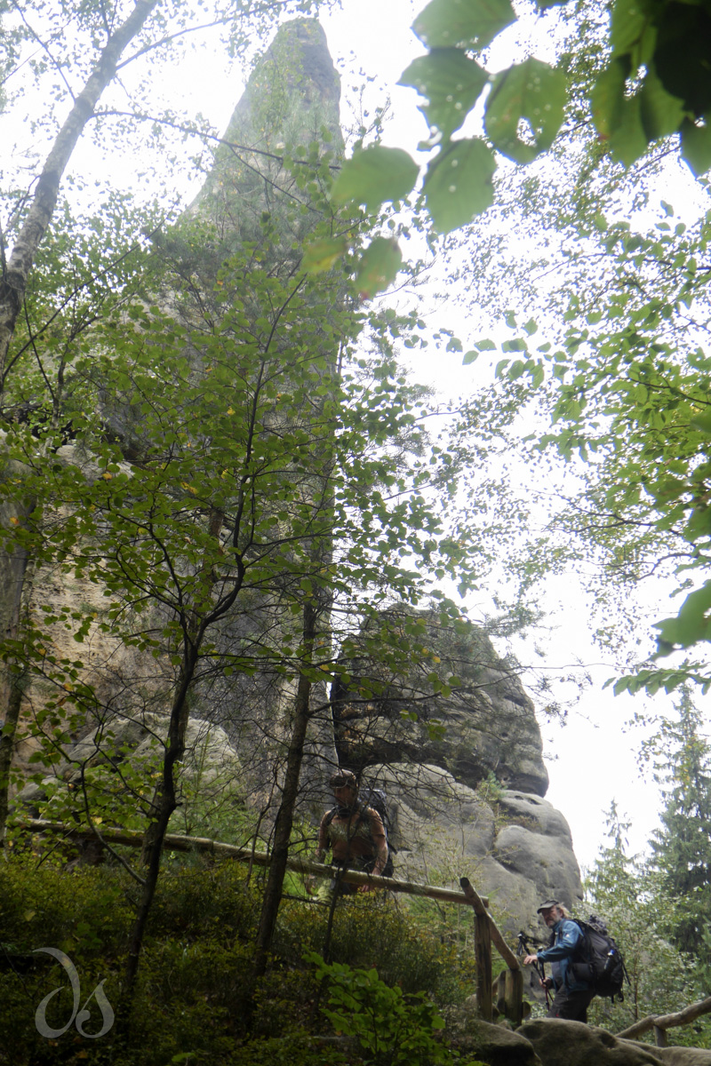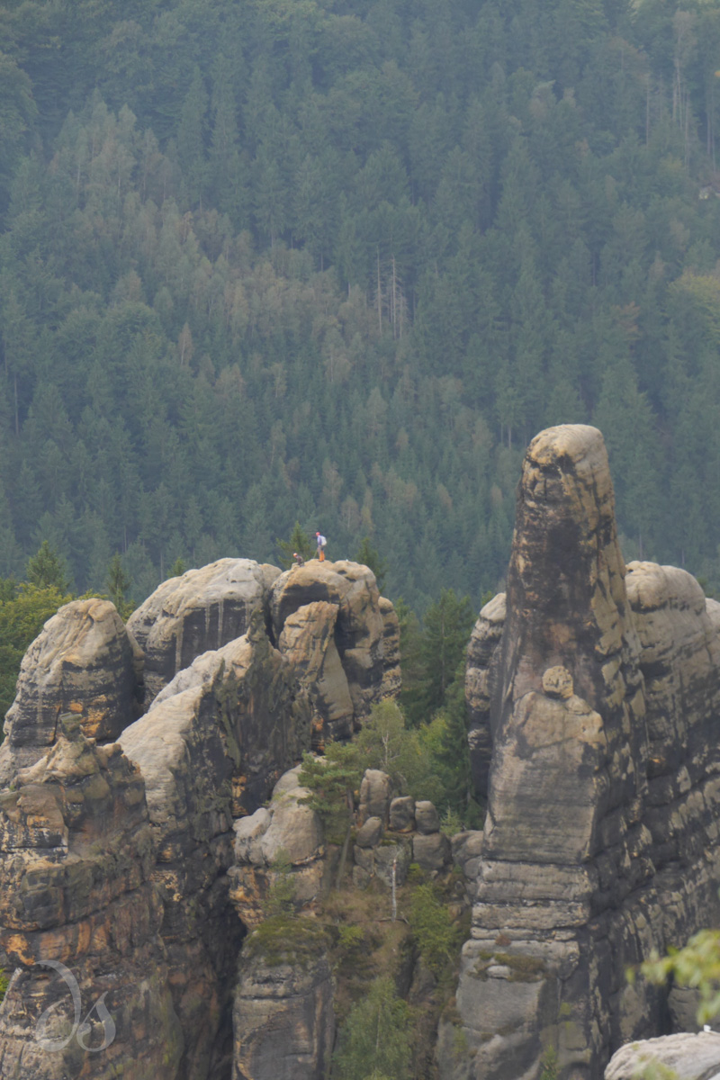Und dann hoch auf die Felsen! Man muss ja nicht gleich klettern, wie die zwei hier, die sich gerade am fast senkrechten Falkenstein hoch arbeiten. Hier in der Sächsischen Schweiz hat das Sportklettern 1864 seine Anfänge gehabt, sagt Daphna. Im Sinne von Turnvater Jahn kraxelten sie die Wände empor – und heute immer noch möglichst ohne fest verankerte Kletterhaken. Aber streng nach den „Sächsischen Kletterregeln“. Nu ju – für uns Normalos gibt’s spannende Wege und Stiegen nach oben: