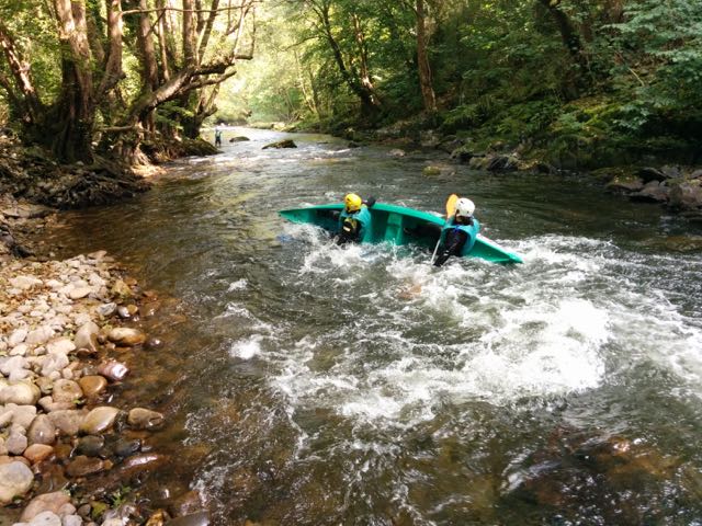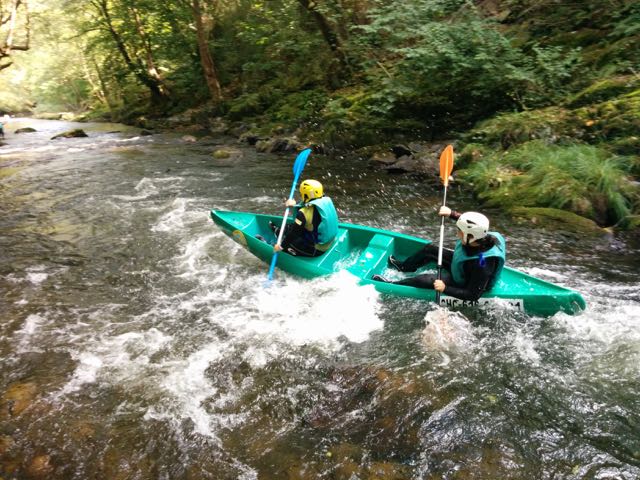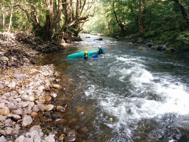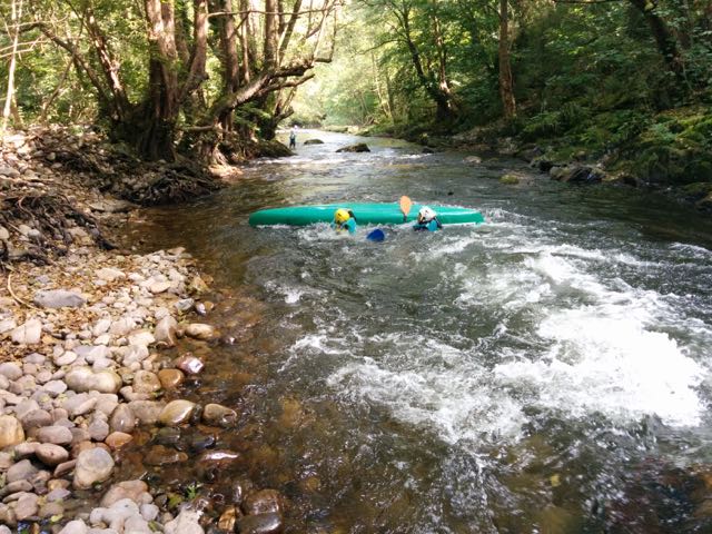 Meine Mitfahrerin Ana (vorne im Boot) aus Asturien war auch nicht gerade ein Leichtgewicht. Weil der Narcea im Spätsommer sehr wenig Wasser führt, sind wir öfter aufgesetzt und mussten das Boot über die Steine hieven. Das war dann aber auch ein willkommener Anlass für Lachanfälle.