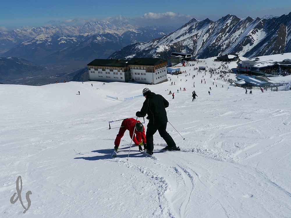 Und am nächsten Morgen grinst Heli verschmitzt und spricht von Hängen und Bergschultern. Seinem Schüler huscht kurz Entsetzen übers Gesicht. Aber hey: Ist der Hang nur breit genug, lässt er sich im Zickzack flach befahren. „Berg- und Tal-Ski“ oder nein, „Innen- und Außen-Ski“ sind heute dran. Bis die Frage aufkommt: Wie zum Teufel kommt man beim Zickzack um die Ecke !? Inzwischen übrigens auf den Gletscherhängen von Kaprun, wo auch der Frühlingsschnee noch fester ist. Jedenfalls kommt hier Schwung in die Sache: