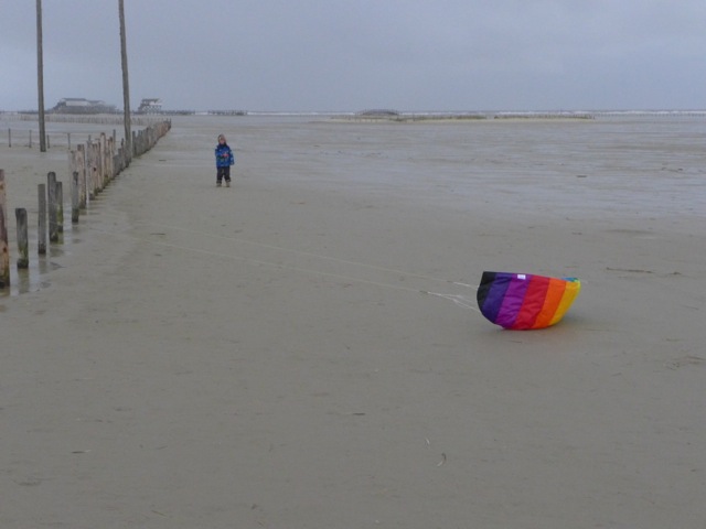 Nach dem Frühstück, für meine Verhältnisse viel zu kurz, drängt zum Strand. Unbedingt will er seinen Drachen steigen lassen. Noch ein paar Monate vorher war der Strand voller Kites und Lenkdrachen. Schnüre und Seile fast ein Labyrinth, kaum ein Durchkommen. Heute haben wir den Strand für uns. Zwischen zwei Regenschauern lassen wir den Drachen fliegen. In wilden Bögen flitzt der bunte Gesell, schwirrt und pfeift durch die Luft. Plötzlich wird es dunkel, vom Meer wälzt sich eine dunkle Wand heran. Schnell fangen wir unseren Drachen ein und laufen ins Hotel. Mit prickelnden Backen, dicken Socken und einer heißen Tasse Tee erzählen wir unsere Abenteuer vom Drachen bezwingen an der Nordsee im Winter.