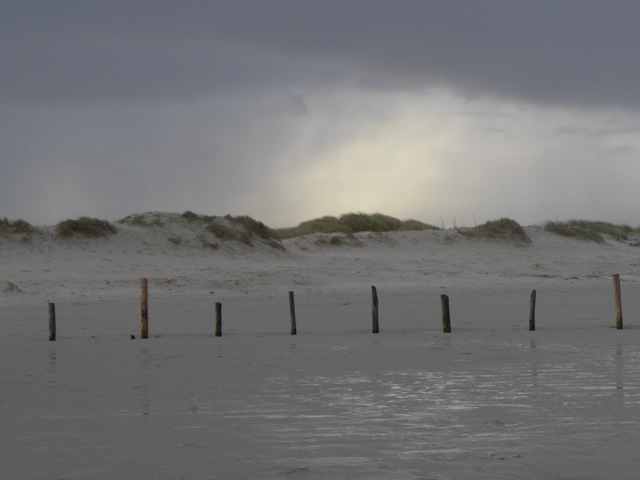 Am nächsten Morgen rast der Wind über die Dünen und das Watt. Endlich kann ich gucken und den phänomenalen Blick genießen. Grau rauscht das Meer am Horizont. Wolken streiten am Himmel, rasen um die Wette, balgen sich zu Bergen, raufen sich in Fetzen. Wolkenschauspiel.