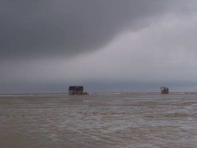 Natürlich tut es weh, wenn der Sturm den Regen ins Gesicht peitscht. So etwa stelle ich mir Schmerzen beim Tätowieren vor. Wasser, Wind und fliegende Sandkörner fressen sich in jedes Fitzelchen nackter Haut. Wehe dem, der sich nicht richtig verpackt hat. Fast fliegen wir. Plusternd treiben Böen uns voran, treiben die dicken Jacken wie Segel voran. Keine Menschenseele im Watt in Sankt Peter Ording! Und dann das Gefühl im Hotel: Überstandene Abenteuer, hartes Mädchen. Pures Glück! Winter an der Nordsee!