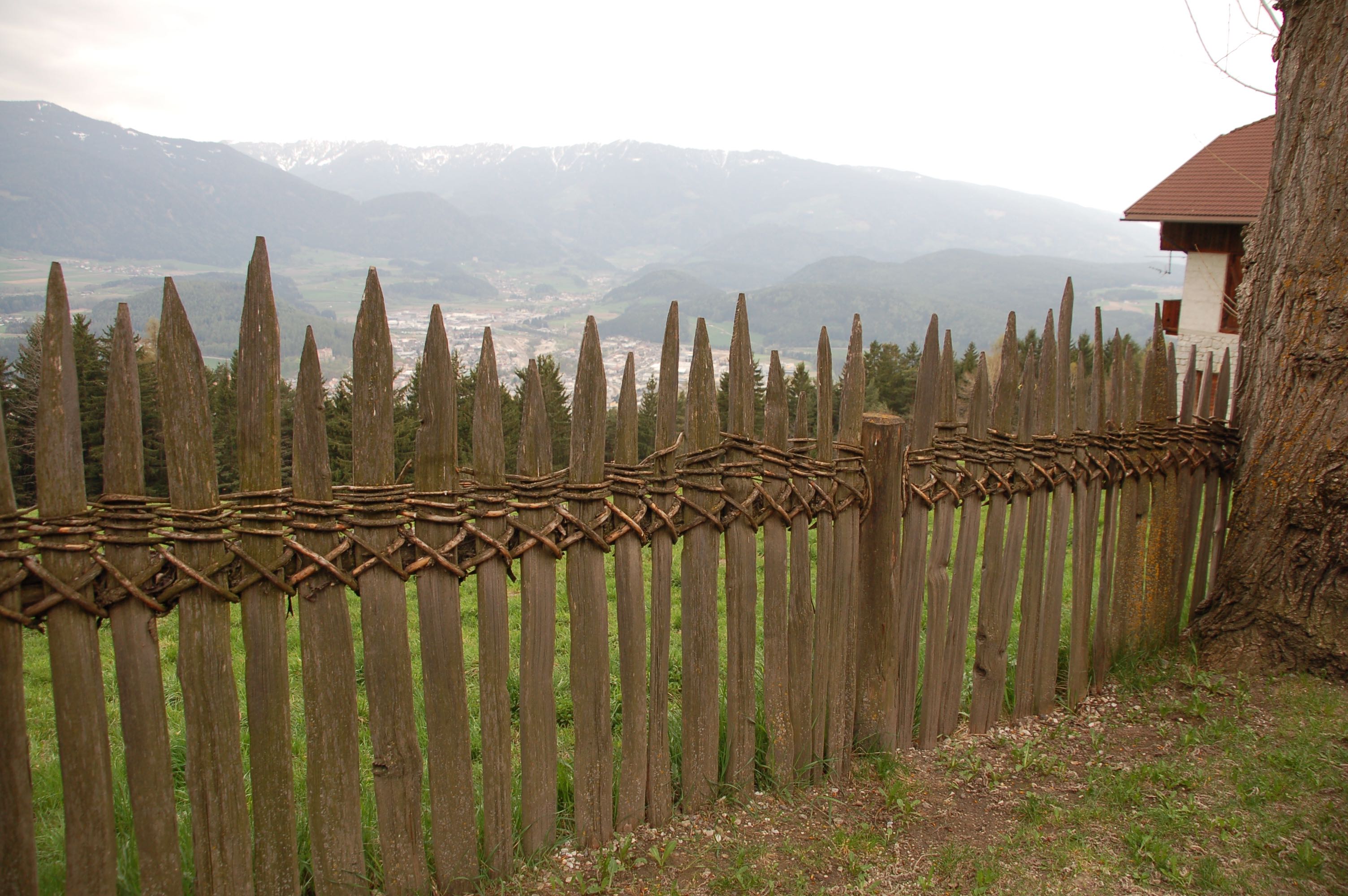 Der Zaun vor dem Gasthof Oberraut in Südtirol fiel mir sofort ins Auge, weil er auf ganz ungewöhnliche Weise durch geflochtene Weidenzweige zusammengehalten wird, gleich daneben das Weidenflechtwerk in Großaufnahme.