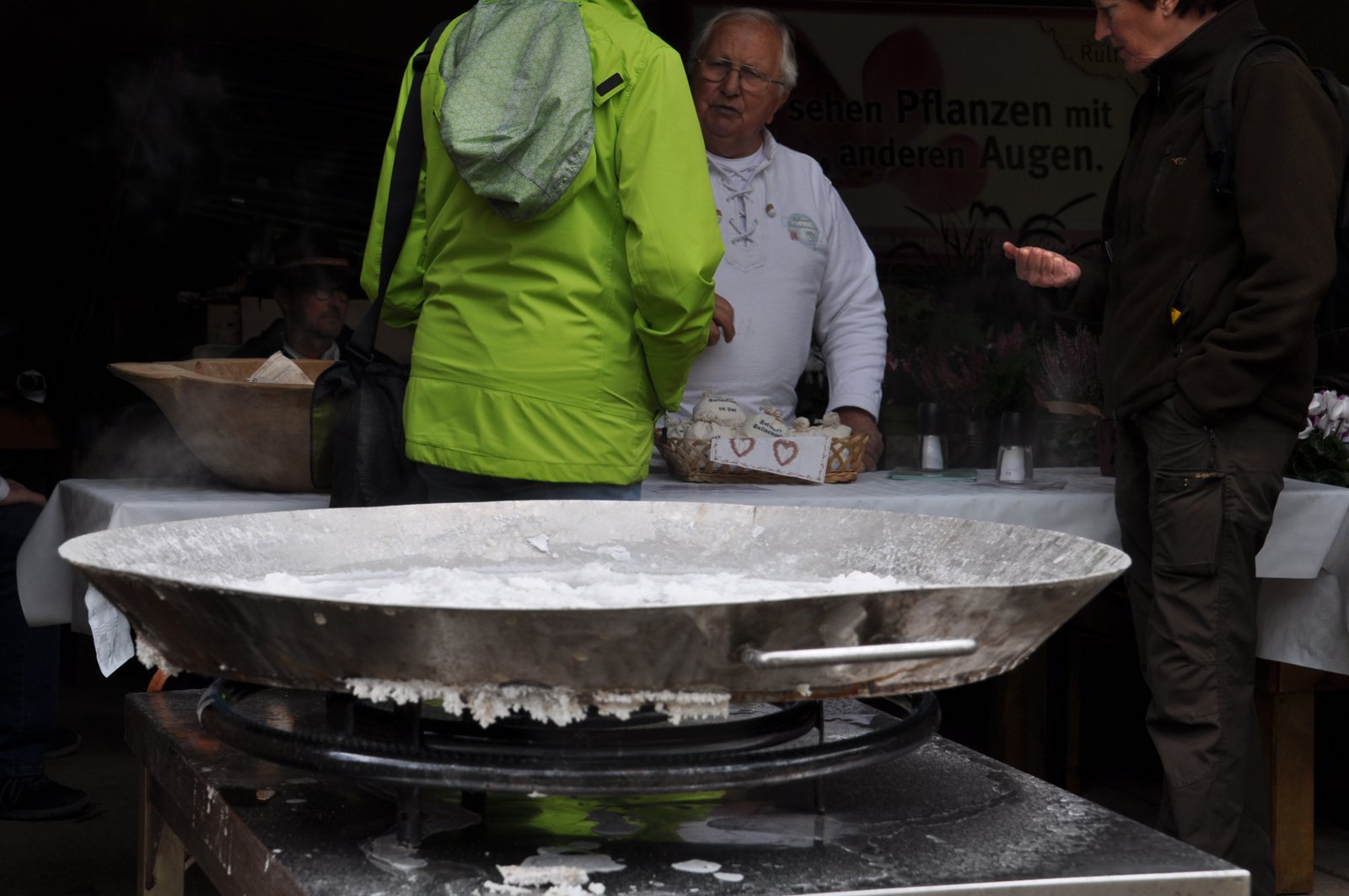 Auf jeden Fall haben wir gestaunt, wie wetterfest die Naturschützer und naturinteressierten Besucher waren. Trotz immer wieder sintflutartiger Regenschauer kamen erstaunlich viele, kein Gemecker war zu hören, die Stimmung auf dem Hof und bei den Besuchern gut. Sie konnten beim traditionellen Pflügen mit Pferden, beim Salzsieden oder beim Baumkletterern zuschauen, Nistkästen selbst bauen, Heidschnuckenbratwurst oder Ziegenmilcheis probieren und im Seminarraum eine kleine Diashow mit Heide- und Tierfotos von Jürgen Borris angucken, unter anderem faszinierende Aufnahmen von Wölfen, Rotwild und dem Moor – und sich hier den Bildband natürlich auch gleich von uns dreien signieren lassen.