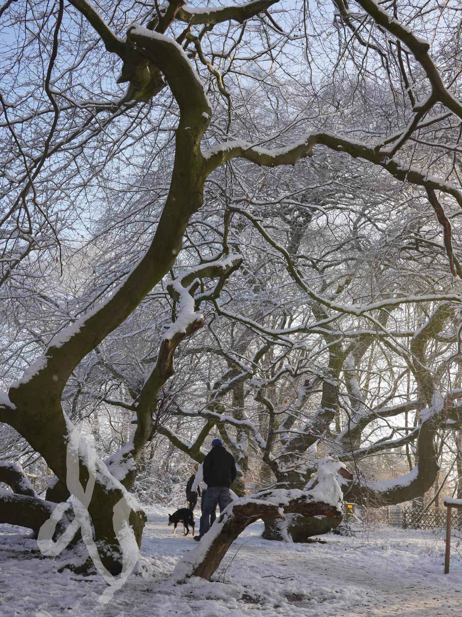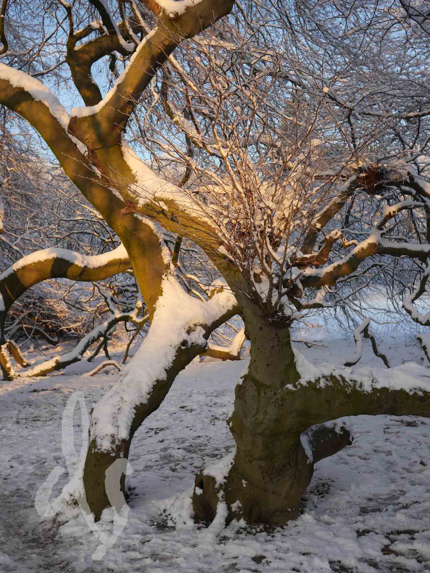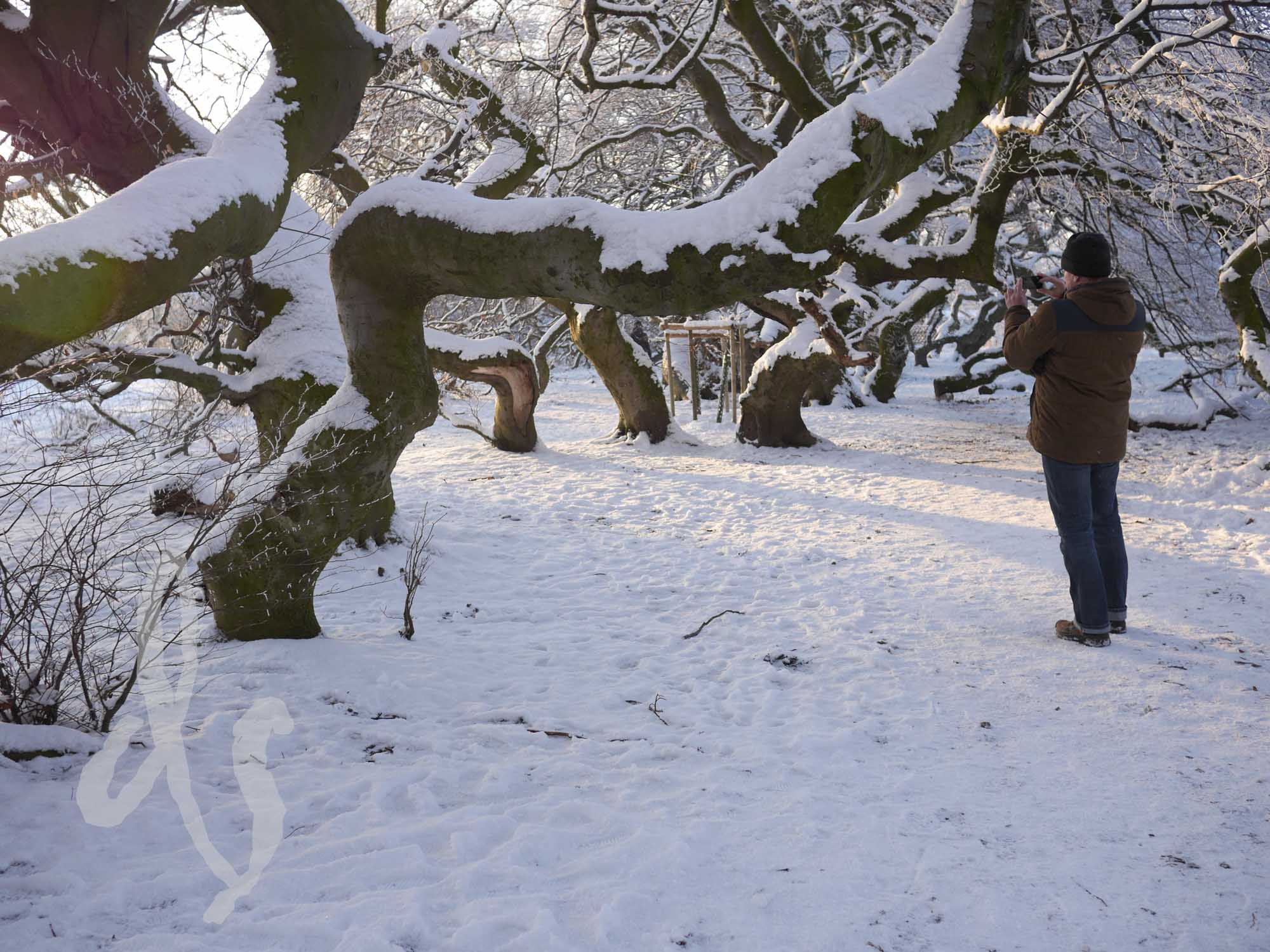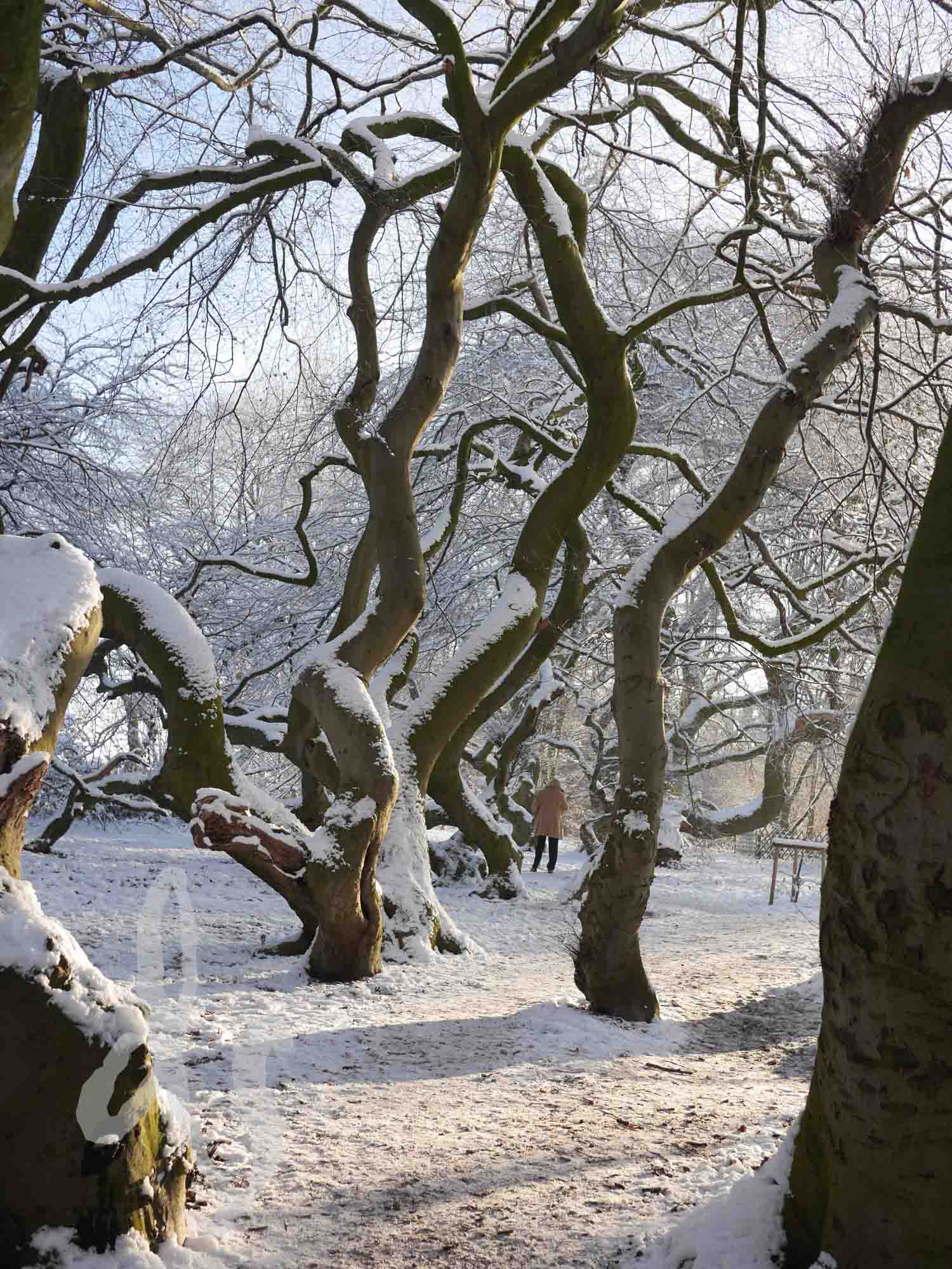 Hexenholz, Schlangenbaum, Teufelsbuche – bei diesem knorzigen Wuchs konnten doch nur böse Mächte die Finger im Spiel gehabt haben?! Die krumm und schief wachsenden Süntelbuchen gehören zu den seltensten Gehölzen überhaupt – doch in Bad Nenndorf steht eine ganze Allee davon. Malerisch. Und besonders im frischen Schnee …Abend und Nacht sind Flocken vom Himmel gerieselt, jetzt haben sich die Wolken verzogen und oben strahlt es blau, unten weiß. Der Atem zeigt sich als weiße Wolken vor den Gesichtern. Während sich ein ganzer Haufen bunt vermummter Kinder den sanften Hang im Kurpark errodelt, bis zum dicken Schneemann ganz unten, warten am Rand der „Liegewiese“ bizarre Schönheiten.