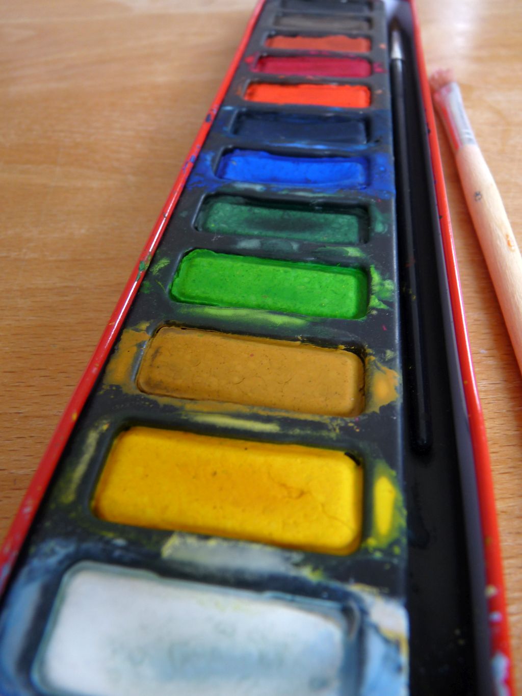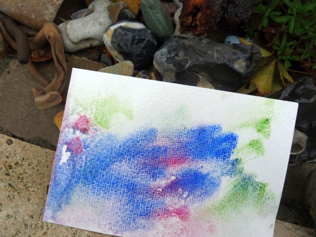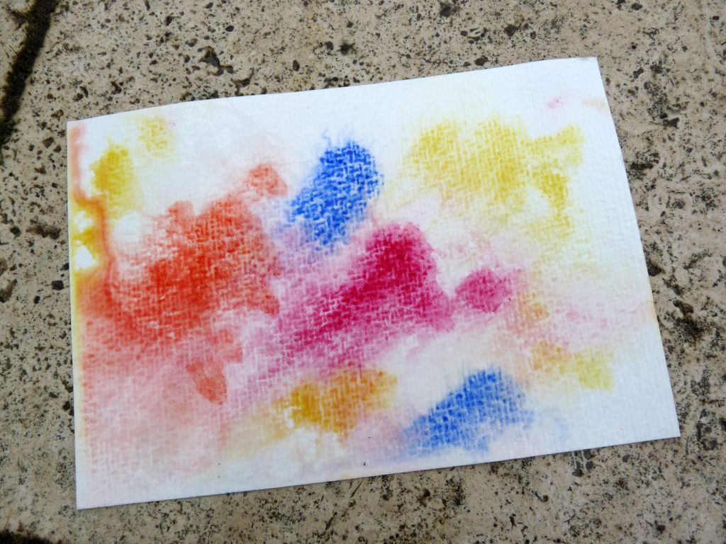 Einfach mit Aquarellfarbe (Tuschkasten tut es auch) ein paar dicke Farbpunkte auf Papier klecksen (am besten ist wirklich das dicke, saugfähige Aquarellpapier, aber wer keins hat, nimmt eben anderes und experimentiert damit), das Papier nach draußen in den Regen legen und abwarten… Ich habe nach einer halben Stunde nachgeguckt und eingesammelt. Tolle Farbtupfer im Grau! Lägen die Blätter noch länger draußen, würde das Ergebnis wahrscheinlich pastelliger und verwaschener. Nur die Jaxon-Aquarellstifte, die haben enttäuscht. Da war das Ergebnis ähnlich wie vorher, nur dass das Papier jetzt eben komplett durchgeweicht ist 😉 Also: Klassisch Tuschkasten oder Aquarellfarbe nehmen. Vielleicht ja eine Beschäftigung für die Kinder heute nachmittag? Das Regentief soll ja noch ein bisschen bleiben…