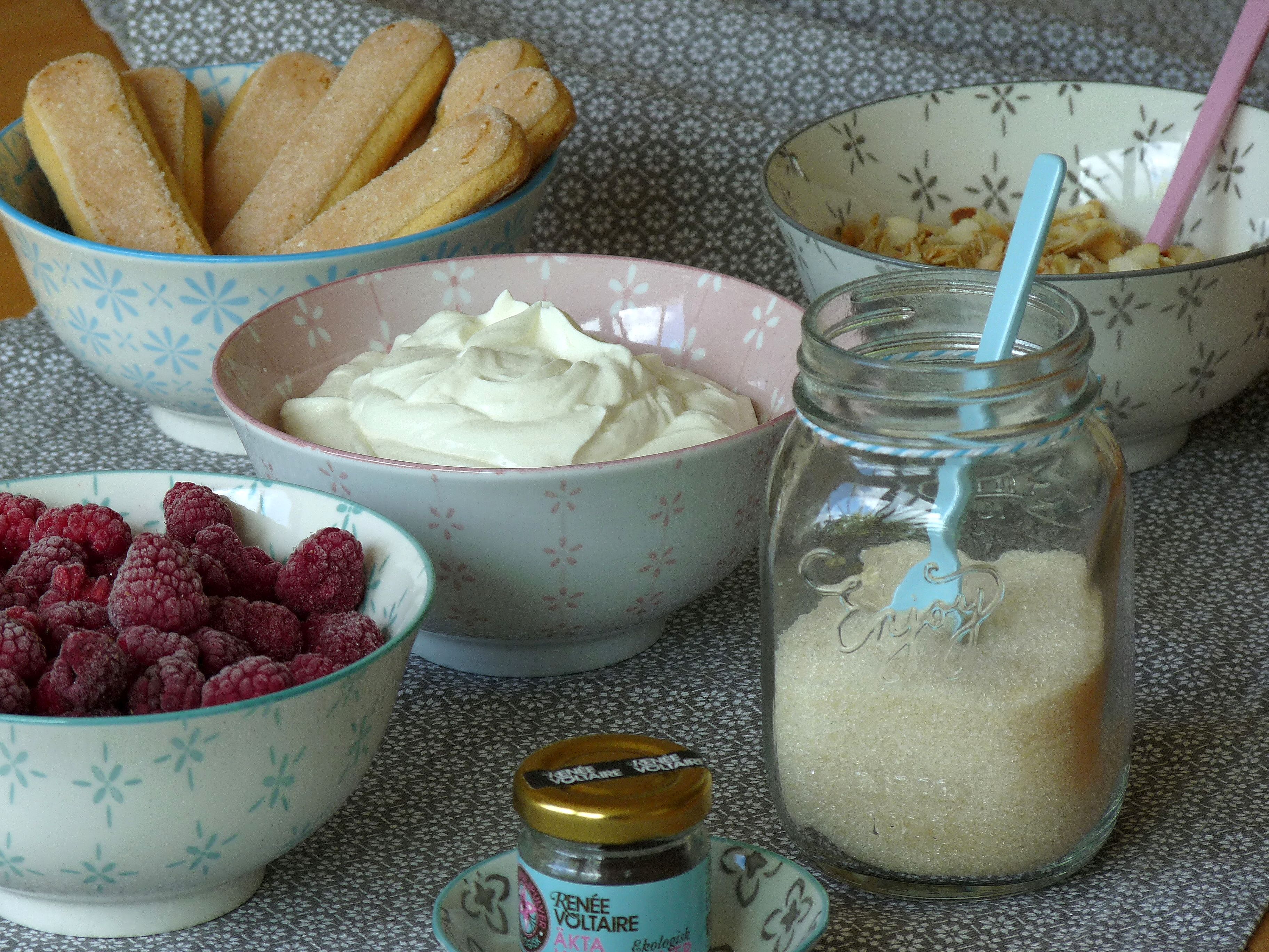 Himbeeren gehen immer. Am liebsten ganz frisch aus dem Garten vom Busch, sonst die tiefgefrorenen, auch sehr aromatischen (weil reif geerntet?) Ein Lieblingsdessert der ganzen Familie ist Himbeer-Trifle, mit Löffelbisquits, cremiger Vanille-Quark-Sahne und gerösteten und karamellisierten Mandelblättchen oben drauf. Im Sommer ersetzt das durchaus auch mal ein warmes Mittagessen…