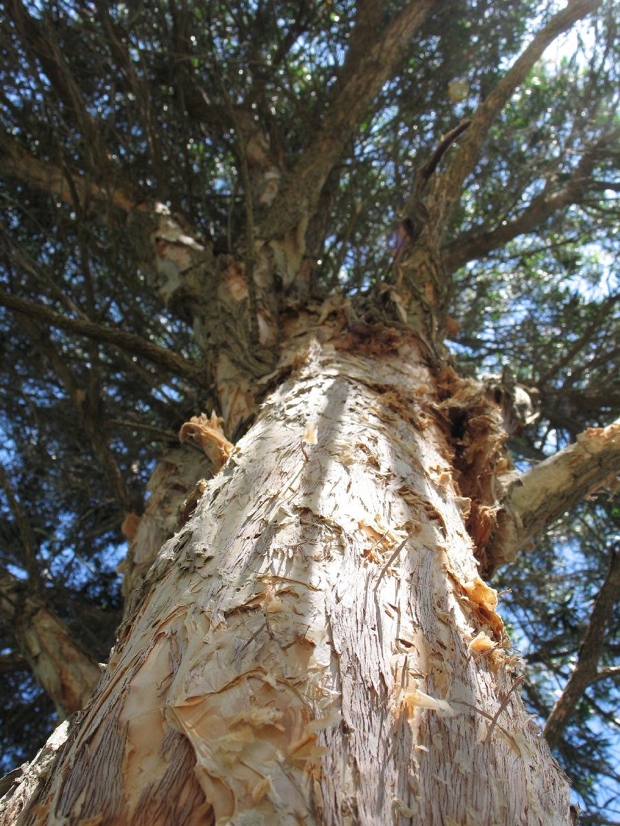 Aber zurück zur Natur: Da wandel/rst Du durch lichten Wald – nicht im sowieso ungewohnten Rainforest, sondern fast noch in Sydney – und plötzlich umstehen Dich Bäume, die aussehen wie Vögel in der Mauser. Die Rinde hängt in Fetzen herab, weiß und beige, überall blättert es. Aber superfein, wie dünne Papierschichten, kann man sie ganz leicht abziehen. Und draufschreiben?