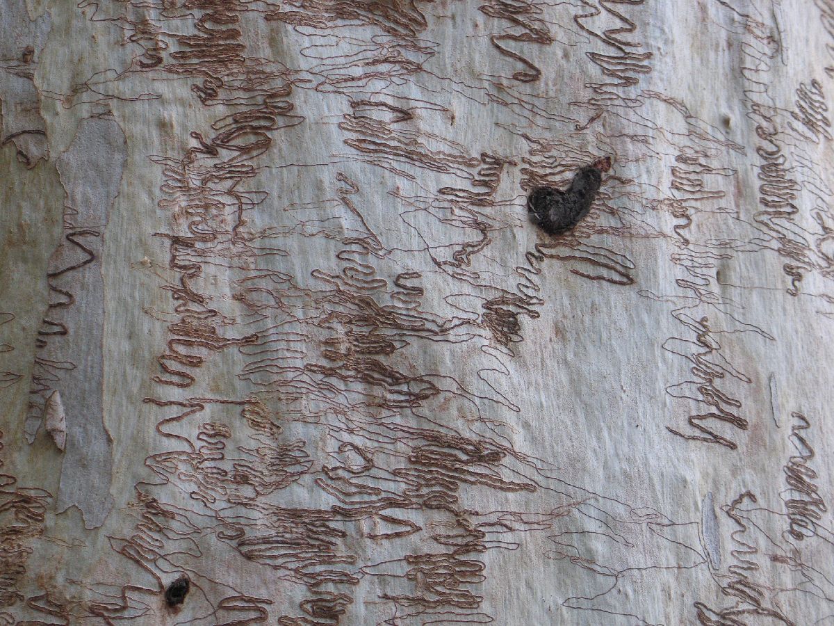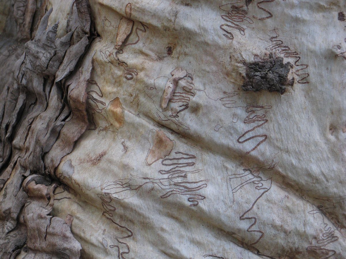 Doch Geheimnotizen der Aborigines? In Wirklichkeit fressen sich kleine Mottenlarven krickelnd durch die junge Rinde und schreiben ihre eigenen Geschichten. Das dickere Ende der Linie zeigt übrigens, wo die Larve wuchs und schließlich schlüpfte…