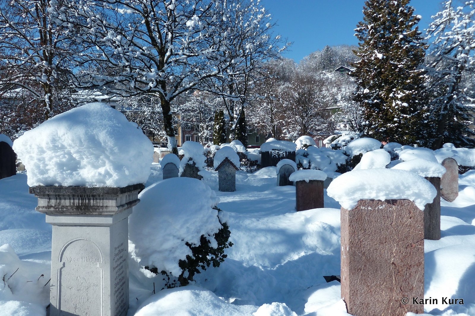 Ich traue meinen Augen nicht, es ist einfach fantastisch: So viel Schnee hatte ich gar nicht erwartet, wow! Von den Grabsteinen auf dem Friedhof in Berchtesgaden, die alle Schneehauben tragen, bis zu den dicken Wattebäuschen, die auf Zweigen und Ästen liegen: Alles wirkt sanfter, viel weicher – der Schnee rundet die Kanten dieser Welt.