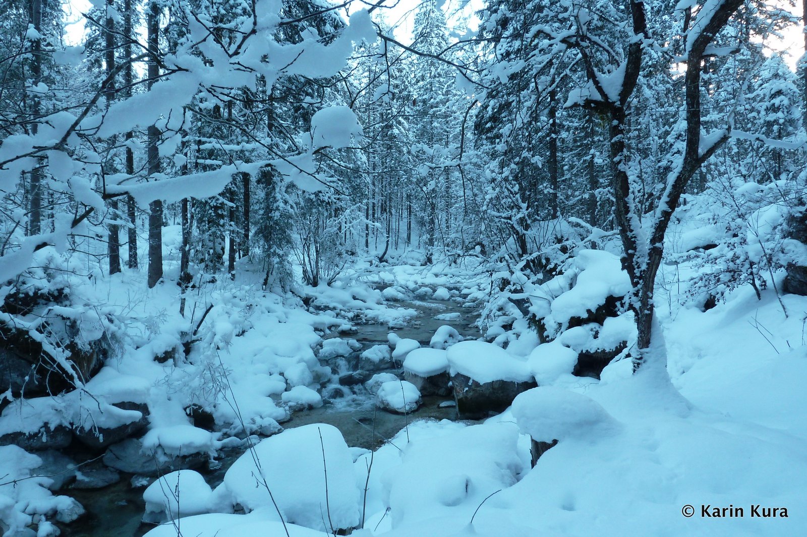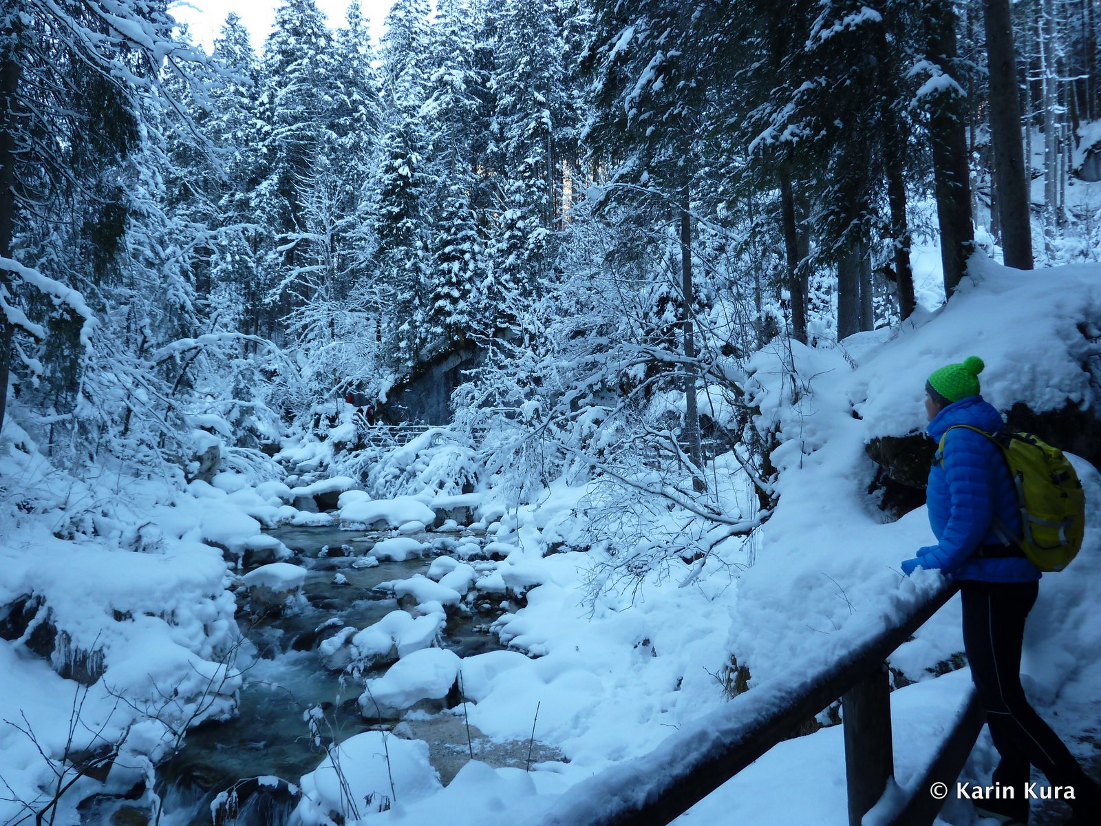 Das Motto der zweiten Wandertour: Schneezauber im Zauberwald. Es geht durch den Wald am Gebirgsflüsschen Ramsauer Ache entlang, ( je nach Einstiegsort bis zu zehn Kilometer Strecke) bis zum Hintersee. Die Ache fließt munter und unbeirrt durch eine erstarrte Natur, vorbei an buckligen Steinen und großen Felsbrocken. Die Zweige der Bäume sind mit Eisschichten und Schnee überzogen. Manchmal wirbelt ein Luftzug durchsichtige Flockenschleier von den Ästen. Schneepuder rieselt dann auf die Nase, es bizzelt. Wer so etwas zu Hause hat: Spikes unter den Schuhen könnten hilfreich sein, mitunter sind die Stiegen in der Marxenklamm vereist. Aber schwierig zum Laufen ist auch dieser Weg nicht.