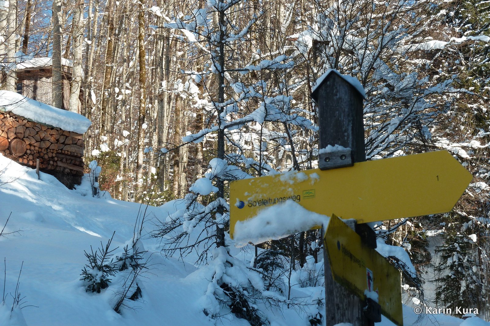 Dazu leuchtet ein blauer Himmel, die Sonne scheint – braucht’s noch mehr? Solche Tage darf man sich nicht entgehen lassen, wer weiß, wann’s danach mal wieder richtig Winter wird… Ich stelle euch zwei entspannte Winter-Wandertouren vor, geräumt und fürs Laufen präpariert. Da wäre zunächst der Soleleitungsweg. Er folgt der alten Pipeline für die Sole, darin floss also die Brühe mit dem weißen Gold, so kostbar, wie es früher war. Aus dem Berchtesgadener Salzbergwerk nach Bad Reichenhall (ja, das Bad Reichenhaller Salz kommt aus Berchtesgaden), ungefähr 30 Kilometer weit. Salz wird auch heute noch abgebaut, aber die Pipeline verläuft woanders. Aus der alten Strecke ist ein feiner Wanderweg geworden. Ein schmaler Höhenweg, ziemlich eben, logisch, sonst hätte die Sole ja nicht fließen können.