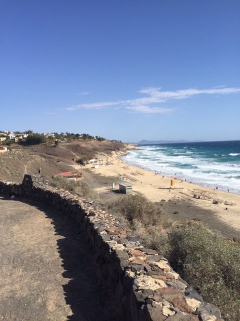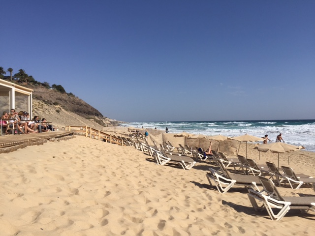 Gerade wenn es draußen regnet und stürmt, wünsche ich mich – wie bestimmt auch viele von euch – in die Sonne und an den weißen Sandstrand. Selbst im tiefsten Winter sind da die Kanaren ein optimales Ziel, wie ich gerade wieder festgestellt habe – und selbst die Kanaren-Fans stimmen wohl überein, dass die Strände auf Fuerteventura mit die schönsten der Islas Canarias sind: schneeweiß bis goldgelb und samtweicher Sand. An der drei Kilometer langen Esquinzo/Butihondo Beach im Südosten des Eilands unterhalb der hohen Klippen des Robinson Clubs liegt ein nettes gemütliches chiringuito, ein einfaches Strandlokal, wo die Gäste wunderbar die Füße in den Sand stecken können, während sie Champagner-Sangria mit Ananas schlürfen – und einfach so auf die Segler, Surfer und die riesige oft tosende Brandung starren. Fuerte zum Träumen!