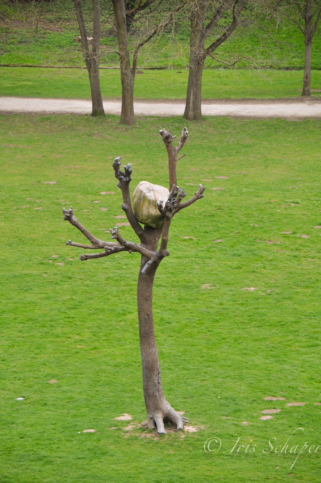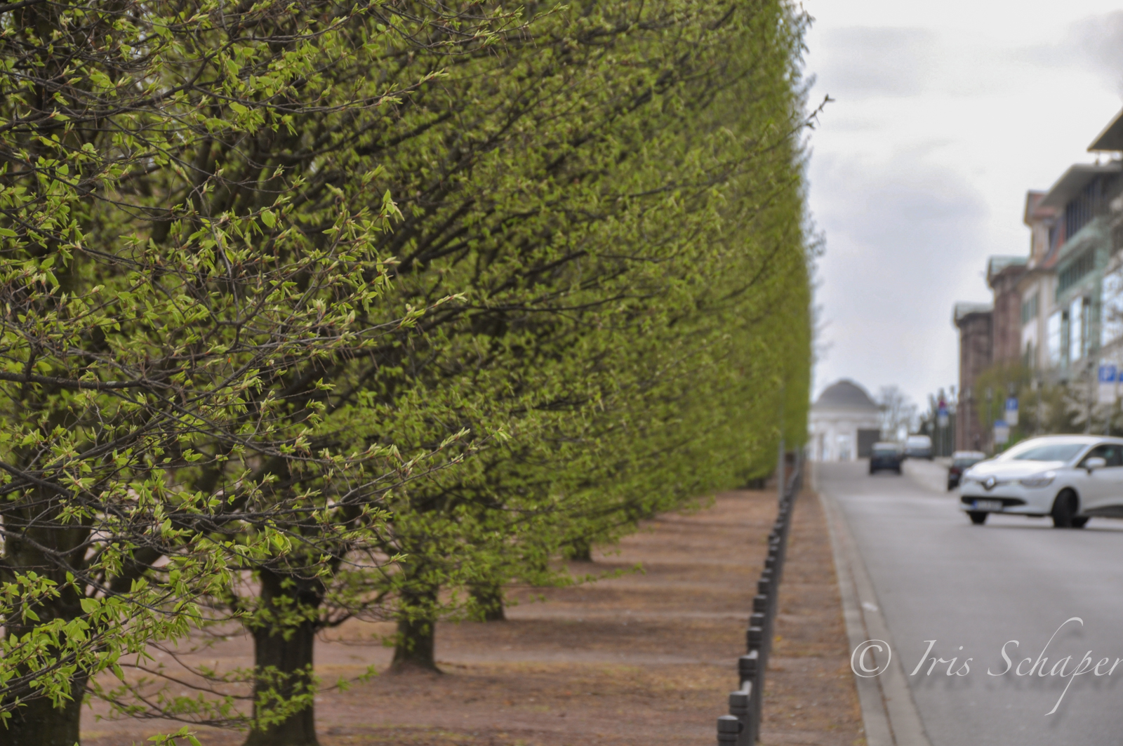 Bei dieser Straße ist Name Programm: Nach dem Krieg wurde der Schutt der zerbombten Häuser an den Rand der Innenstadt geschoben, geblieben ist ein Steilhang. An dem wächst heute ein Meer aus blühenden Bäumen, die besonders im Frühling prächtig anzuschauen sind und den Blick freigeben auf die Karlsauen und Orangerie und auf ein weiteres documenta-Kunstwerk: den berühmten Pennone-Baum. Diese Bronzeplastik mit dem erdrückenden Stein im Geäst sieht einem echten Baum täuschend ähnlich und hat schon manchen Kasselbesucher irritiert näher treten lassen, um den eigenartigen Baum zu begutachten.