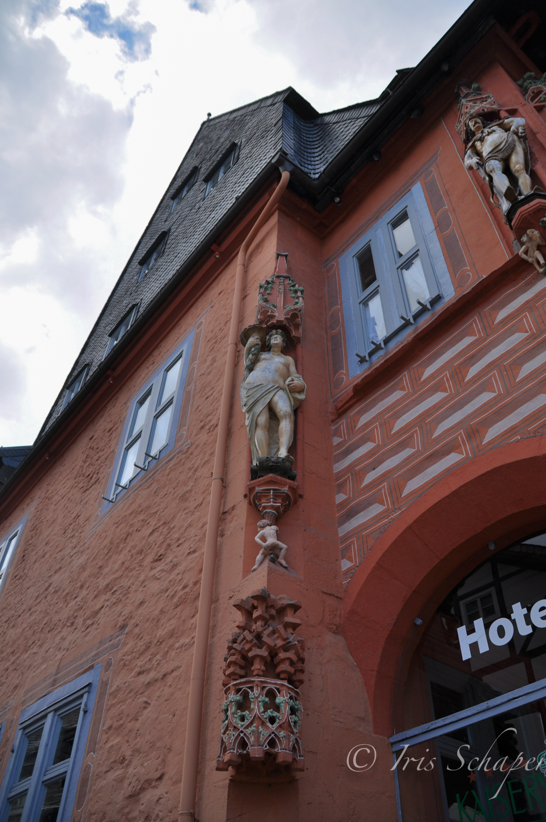 Dass es sich in Goslar lohnt, auch auf Kleinigkeiten zu achten, zeigt sich besonders an den geschnitzten Figuren der alten Fachwerkbauten. Am meisten eingeprägt haben sich mir dabei zwei Hinterteile: Die runden Backen des „Dukatenscheißers“ (oder feiner ausgedrückt „Dukatenmännchen„) und der „Butterhanne„. Ersterer befindet sich am berühmten Hotel Kaiserworth. An der Ecke zur Worthstraße ist eine übergroß geschnitzte Göttin des Überflusses „Abundantia“ zu sehen und darunter winzig klein das berühmte „Dukatenmännchen“, der Grund? Das Hotel war früher das Zunfthaus der reichen Gewandmachergilde. Die hatte den nackten Mann, der hier am Pranger steht, zur Warnung anbringen lassen. Denn säumige Schuldner mussten sprichwörtlich zur Strafe vor aller Welt am Pranger „die Hosen runterlassen“.