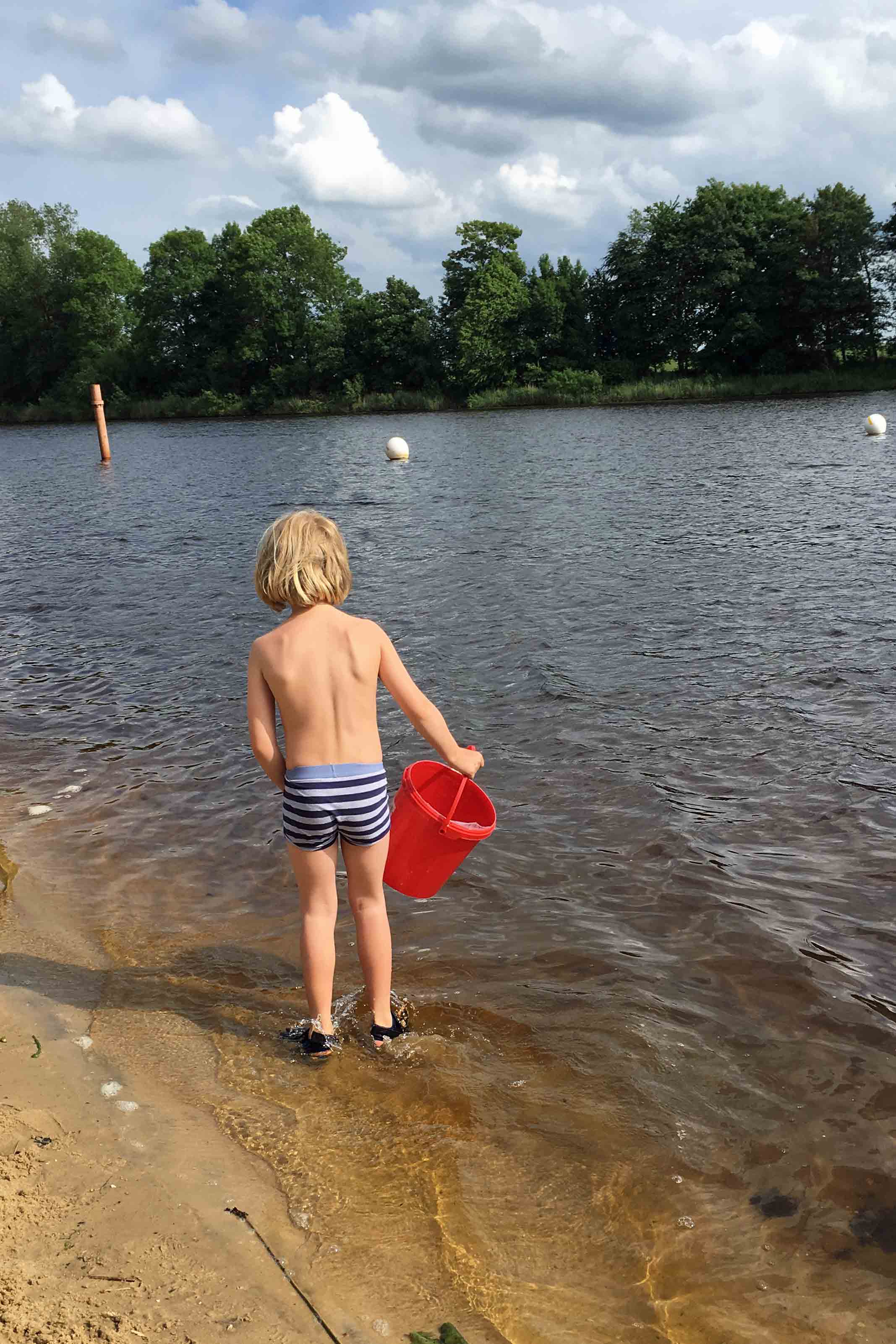„Hausboot Hecht“ steht auf einem Holzschild, das sanft an der Reling schaukelt. Unser Hecht ist nicht wirklich ein Boot, sondern ein modernes, ganz neues Ferienhaus im skandinavischen Look, das auf einem Ponton auf der Eider schwimmt und mit dem Land fest vertäut ist. Dennoch stellt sich sofort das typisch gemütliche Schiffsgefühl ein, wenn Wellen das Häuschen mit seiner großen Terrasse wiegen. „Ich geh Angeln!“, kreischt Freddie, als er einen Kescher entdeckt, den er sich schnell schnappt und damit verschwindet. Sein Jagdfieber ist geweckt, er sprintet zum Steg und gründelt mit dem Netz nach Fischen. Zum Glück kann er gut schwimmen und zur Sicherheit und eigenen Beruhigung haben wir ihm eine knall orangefarbene Schwimmweste verpasst.