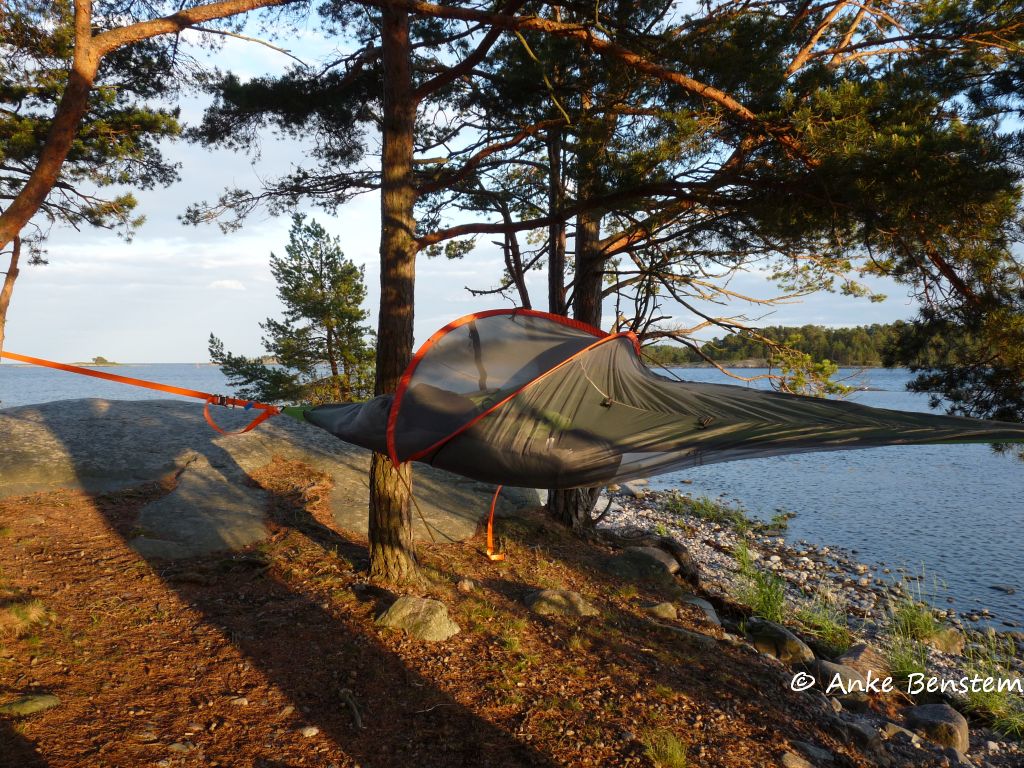Nach Harstena würde man von hier vier bis fünf Stunden im Kajak brauchen, erklärt Christian. Und zeigt nach vorne: Da. über der nächsten Insel kreist ein Seeadler. Die Zahl der Vögel wächst in der letzten Zeit wieder an. Auch Seehunde, früher stark bejagt in der Region, sieht man nun wieder. Sie trauen sich näher ans Land, wenn die Heringsschwärme jetzt, im Frühsommer, kommen. Bald ist das heutige Nachtlager erreicht, kurze Zeit später hängen die Baumzelte bezugsfertig in der Luft. Mehr als drei im passenden Abstand stehende Bäume braucht es nicht, um das Zelt mit wenigen Handgriffen zu befestigen. Bald prasselt ein Lagerfeuer und das Essen ist auf den mitgenommenen Gaskochern fix heiß gemacht. Danach gibt es den letzten Kaffee des Tages, diesmal mit Schokolade, und hinterher noch ein kaltes Bier. Als es irgendwann dann doch langsam dunkel wird – und das ist jetzt im Juni tatsächlich sehr, sehr spät –, plätschern die Wellen der Ostsee so einschläfernd ans Ufer, dass ich nach wenigen Minuten tief und fest im Baumzelt eingeschlafen bin.