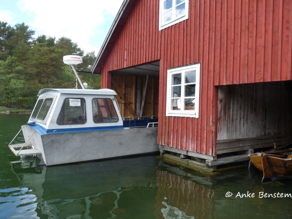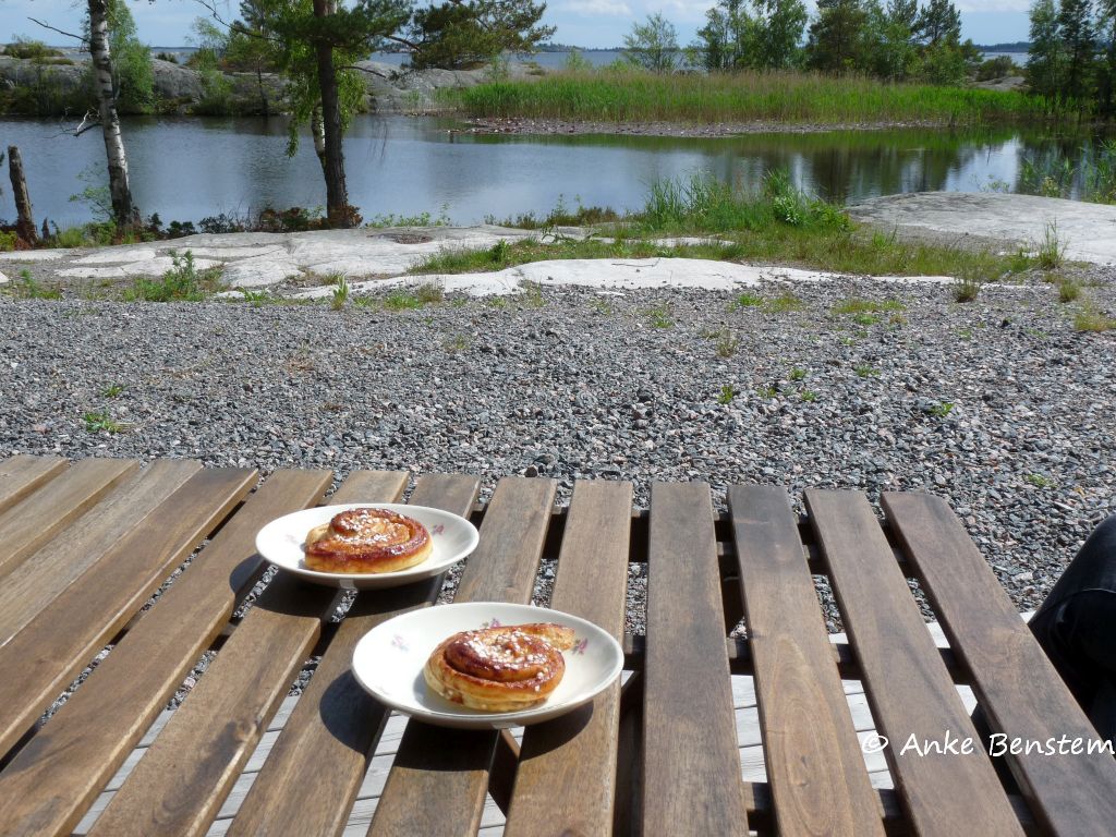 Magnus Lindkvist vom Harstena Turistservice holt uns mit dem Taxiboot ab. Eine Dreiviertelstunde lang ziehen nun immer wieder Inseln und Inselchen an uns vorbei, mal mit roten Sommerhäuschen am Ufer, mal nur mit Wald bewachsen, mal steht ein Reh am Ufer. Oder war es ein Elch? Vielleicht auch eine Kuh. Zu spät, das Motorboot ist schon zu weit weg… Dann biegen wir in eine Art natürlichen Kanal ein und sind da. Harstena, einst Hot Spot der Robbenjagd , ist heute ein bliebtes Ausflugs- und, klar, Fika-Ziel bei Seglern, Paddlern und anderen Bootskapitänen. Man kommt her, macht sein Boot fest und ein Picknick am Hafen.