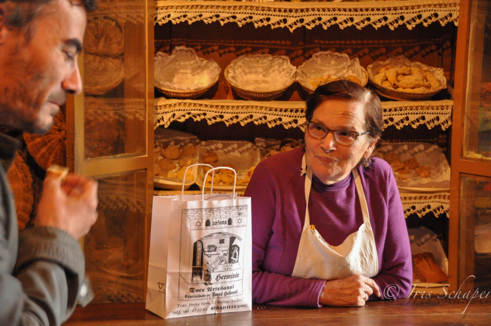 Galicische Spitze ziert die Regalböden, in denen Körbchen stehen, gefüllt mit Kupferlin, Ghorayebah, Mamoule und Kamish-Broit. Manche Namen klingt hebräisch, manche jiddisch. Kein Wunder, denn nachdem sie die kanadischen Musiker mit ihrem Gebäck so erfreut hatte, trug man Herminia Rezepte aus der ganzen Welt zu. Ob aus uralten sephardischen Büchern oder aus jüdischen Familien. So kam es also, dass Herminia inzwischen zur offiziellen Gebäck-Lieferantin der israelischen Botschaft in Madrid aufgestiegen ist und sich gänzlich auf jüdische Köstlichkeiten spezialisiert hat. Aber nicht nur deshalb lohnt der Besuch in der Bäckerei der 80-jährigen Dame.