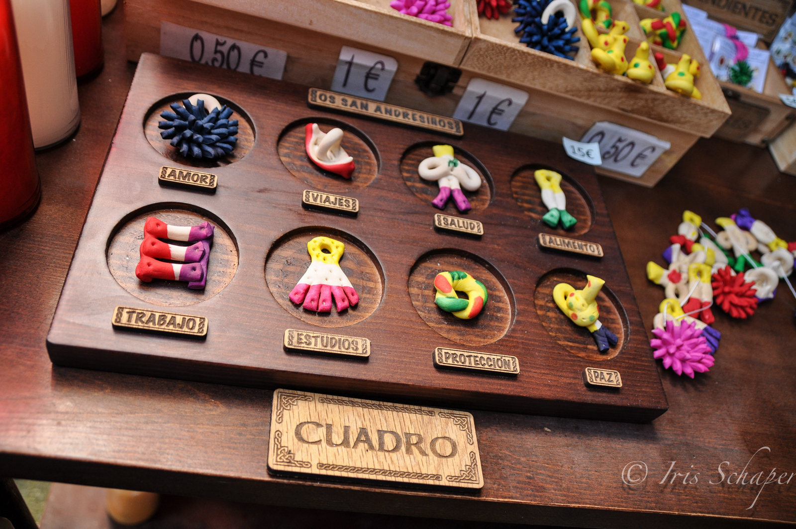 Jeder Pilger bringt eines dieser Amulette mit nach Haus, sie sollen den Käufer beschützen und ihm Glück bringen: Je nach geformtem Symbol bringen die Amulette Liebe, Arbeit und Geld, schöne Reisen, Gesundheit, Frieden oder auch einen klaren Verstand. Wegen all dieser nützlichen Wirkungen, kaufen die meisten Pilger diese Amulette gleich im Achterpaket – in Galicien weiß man ja nie…