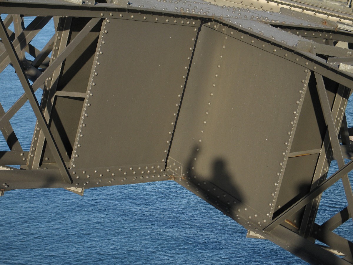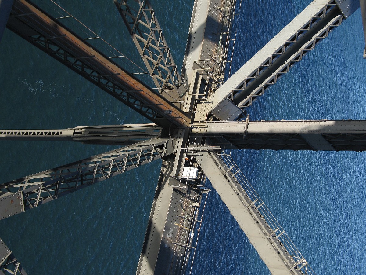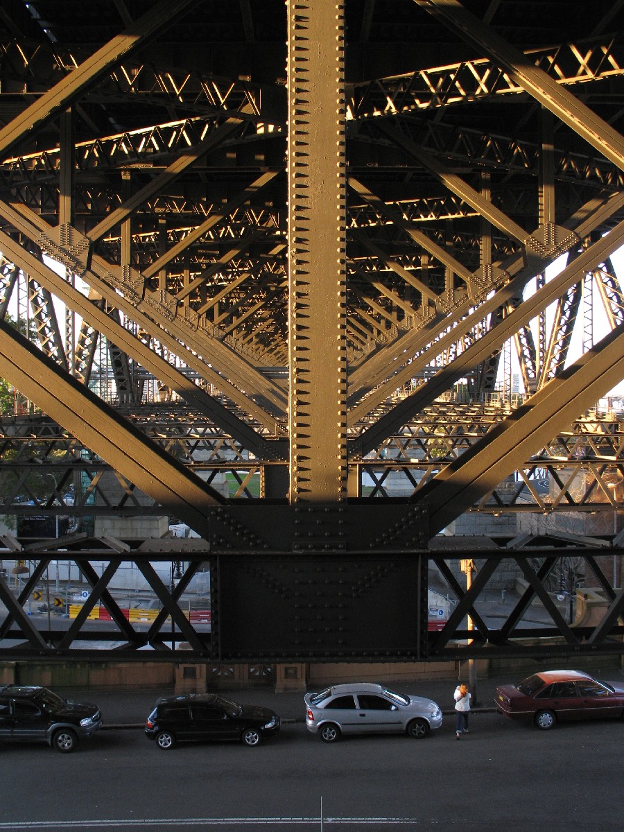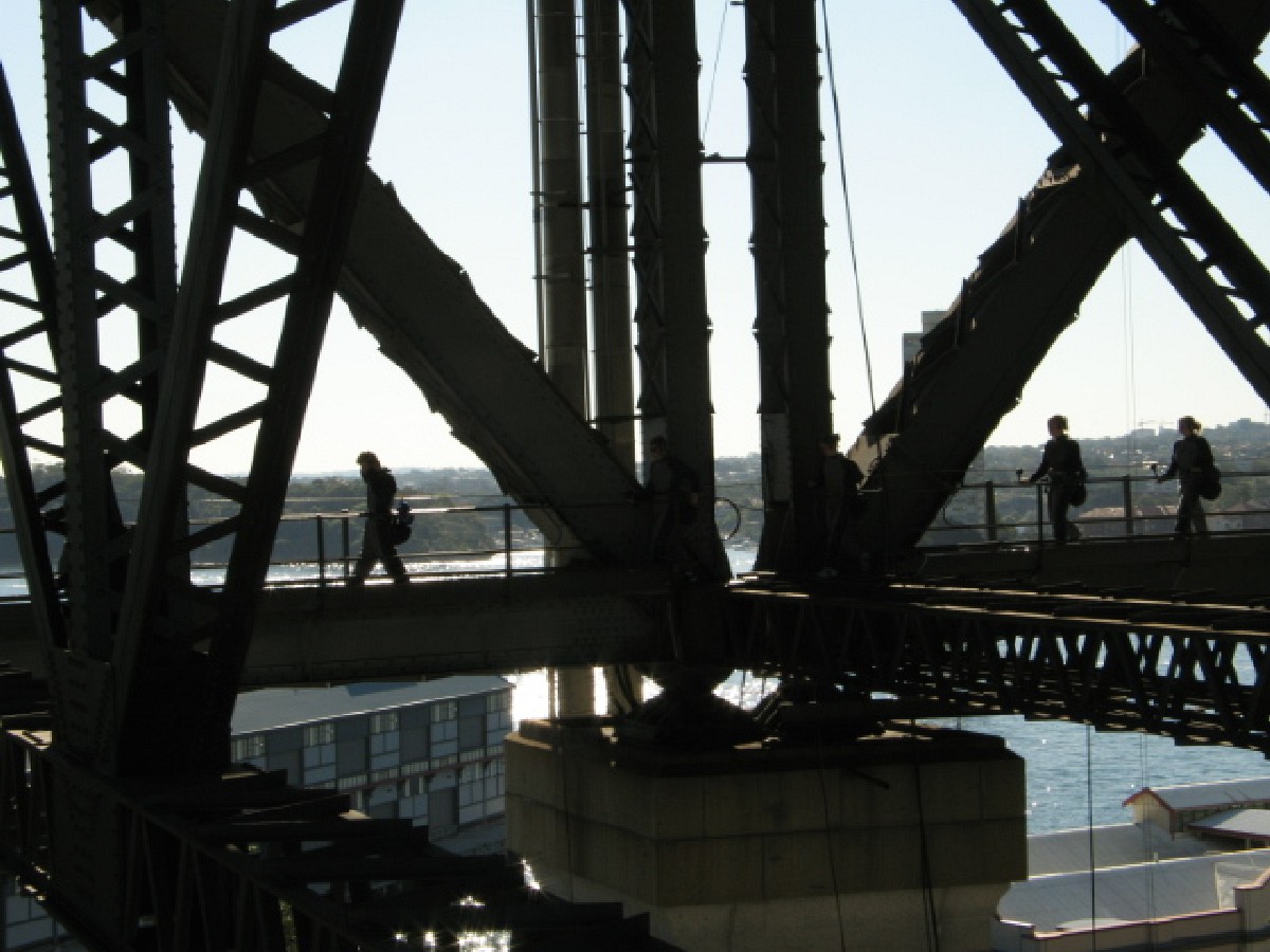 Unten, da fließt der Verkehr auf dem Highway über die breite Brücke, die die Hafeneinfahrt seit 1932 überspannt. Noch eine Etage tiefer kreuzen Schiffe, Boote und natürlich Sydneys typische Fähre hindurch. Und los geht’s! Für den Aufstieg erstmal hinein ins Gewirr der Eisenbalken und Verstrebungen – vorbei an den sechs Millionen Nieten, die das Konstrukt zusammenhalten. Ein Meisterwerk gegen die weltweite Wirtschaftskrise damals.