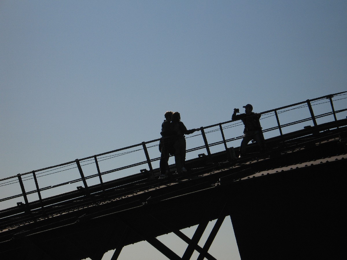 Viele enge Metallstiegen führen nach oben, wo sonst eigentlich nur die Techniker und Anstreicher entlang kommen. Manchmal heißt es den Kopf einziehen – ich frage mich, wie die ältesten Besucher hier hochgekommen sind. Ganz langsam, vermutlich. Den Rekord hält eine Hundertjährige. Während wir dem Himmel immer näher kommen, erzählt unser „Leader“ über die Anfänge der Brücke