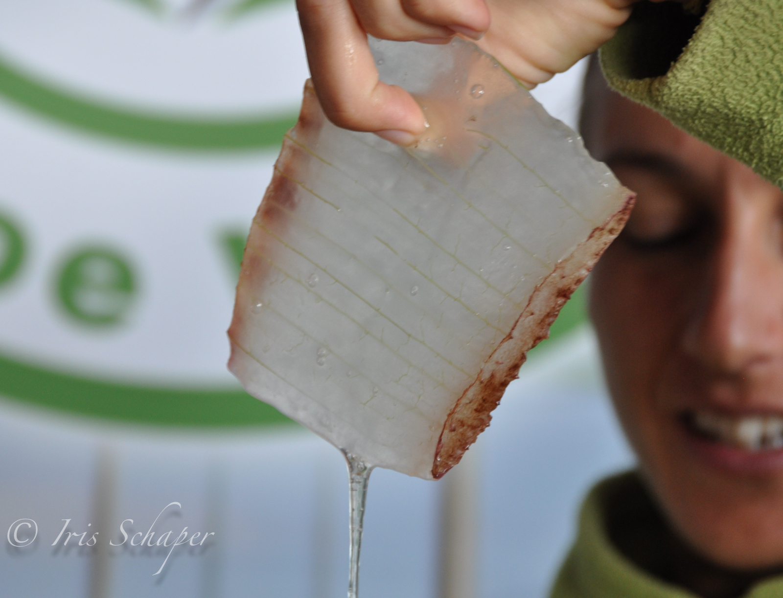 Was mich am meisten erstaunt hat, ist, dass es sich bei diesem berühmten Aloe-Vera-Inhaltsstoff nicht um einen milchig-dickflüssigen Pflanzensaft handelt, sondern einen glasklaren „Schleim“. Unter der dicken Haut der Aloe Vera befindet sich eine wackelpuddingartige Glibbermasse, aus der es kräftig tropft. Und das zweite Aha-Erlebnis hatte ich, als wir uns den direkt von der Pflanze auf die Haut aufgetragen haben.