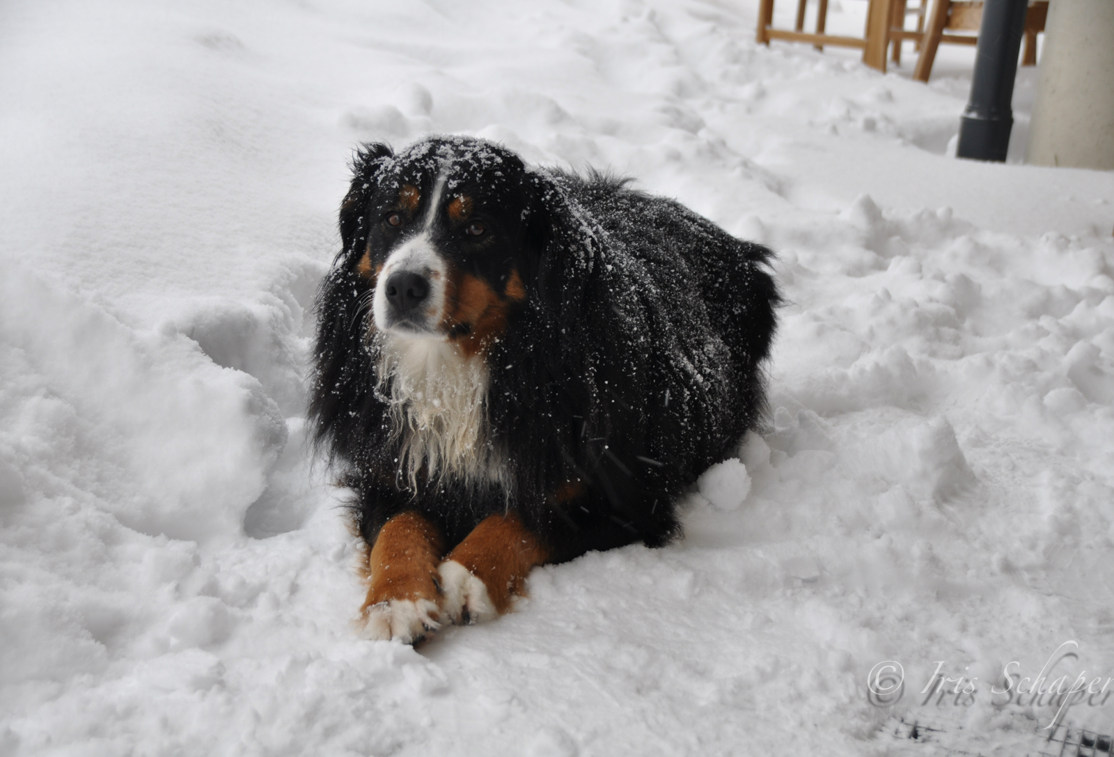 Nur der Hotelhund liegt seelenruhig im Schneegestöber und möchte nicht reinkommen aus der Gefahrenzone in die sichere Lobby.