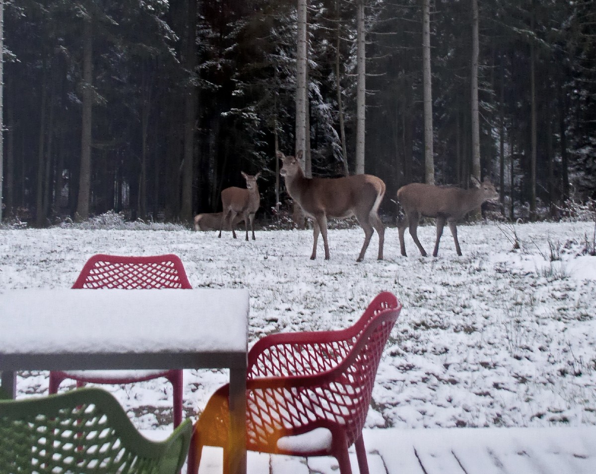 Morgens früh um sechs, zufällig aufgewacht, kommt Aufregung auf: Da stehen Hirsche (oder sind es Rehe?) draußen vor der Terrasse! Äsen, wackeln mit dem Hintern, stapfen langsam weiter in den Wald. Schon komisch, wie „echte wilde Tiere“ immer wieder begeistern! Und ich gebe zu, im Warmen und mit frischem Kaffee in der Hand ist das echt Luxus…