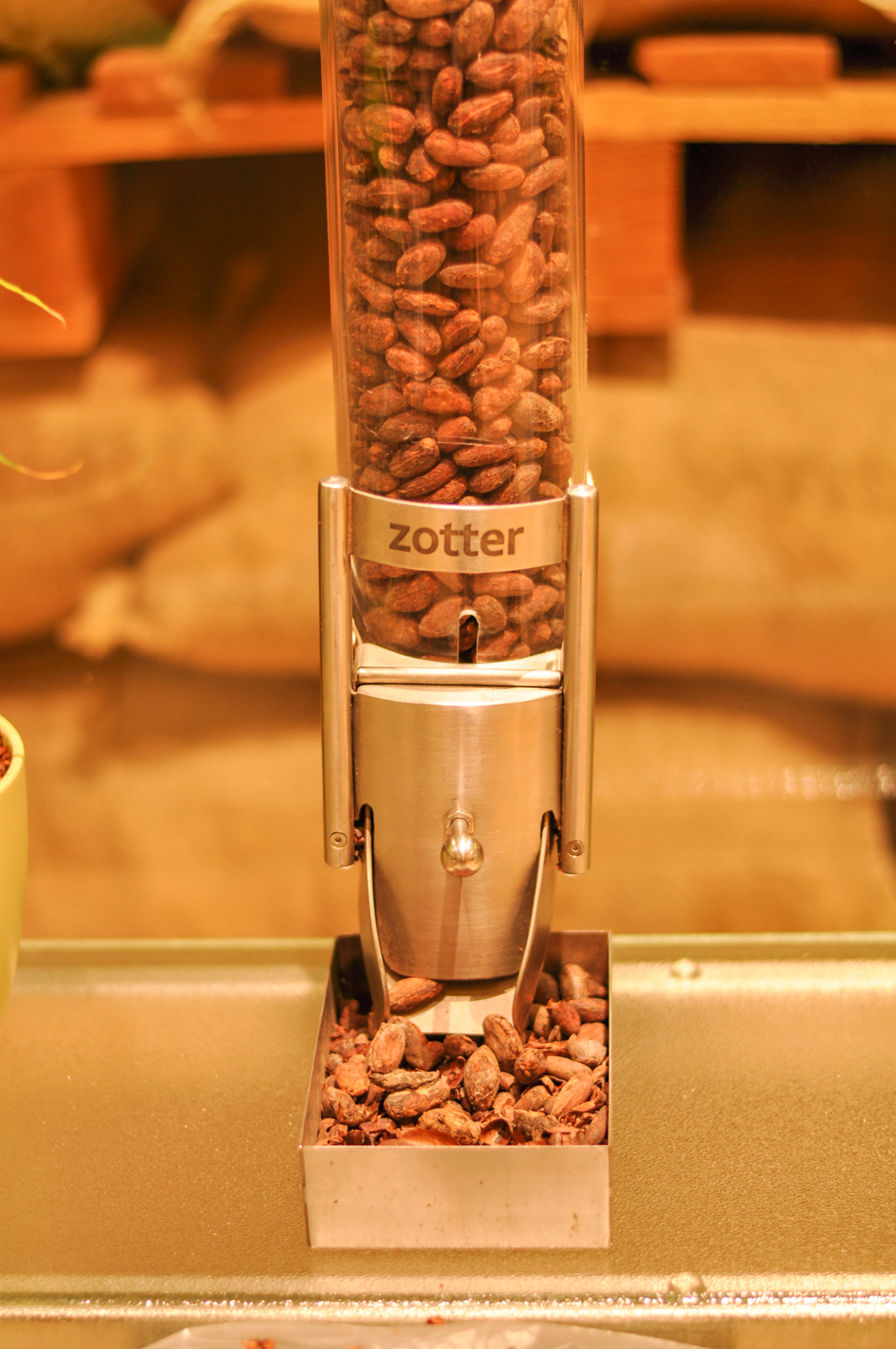 Jeder Besucher bekommt zu Anfang einen eigenen Löffel und kann an den Spendern in der Erlebniswelt Leckereien probieren. Am Anfang stehen die Rohstoffe: Welche Kakaobohne schmeckt mir am besten? Tatsächlich haben Bohnen aus Peru, Mexiko oder Ecuador ganz unterschiedliche Brauntöne und Geschmäcker. Und Zucker ist nicht gleich Zucker – hier können wir den Unterschied zwischen Kokosblüten-, Rohr- und Mascobadozucker erschmecken. Und wir lernen, dass die Kakaomasse aus gemahlenen Bohnen zwar sehr lecker aussieht, aber noch ziemlich bitter den Mund zusammenzieht.