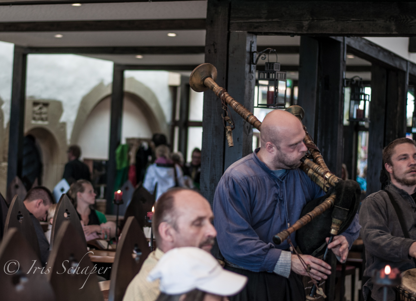 Stühle wie bei den Rittern der Tafelrunde, Kellner in mittelalterlich anmutendem Gewand: Das gute Essen im rustikalen Burg-Ambiente haben wir sehr genossen. Und dank Pfingst-Feiertagen gab sogar Sonderprogramm und Spielleute musizierten. Das gute Essen in der Burgschenke hat sich allerdings herumgesprochen in der Region, deshalb besser reservieren.