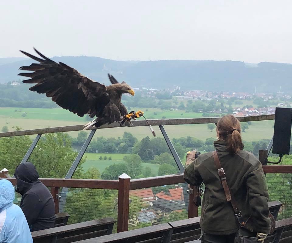 Sie war eines meiner Highlights auf unserer Tour. Allein die Flugshow ist hier ein Ereignis, denn die Burg Guttenberg liegt malerisch auf einem Bergsporn hoch oben über der Landschaft. Noch schöner ist es natürlich, wenn man den Tieren in einer Falkner-Probestunde näherkommen darf.