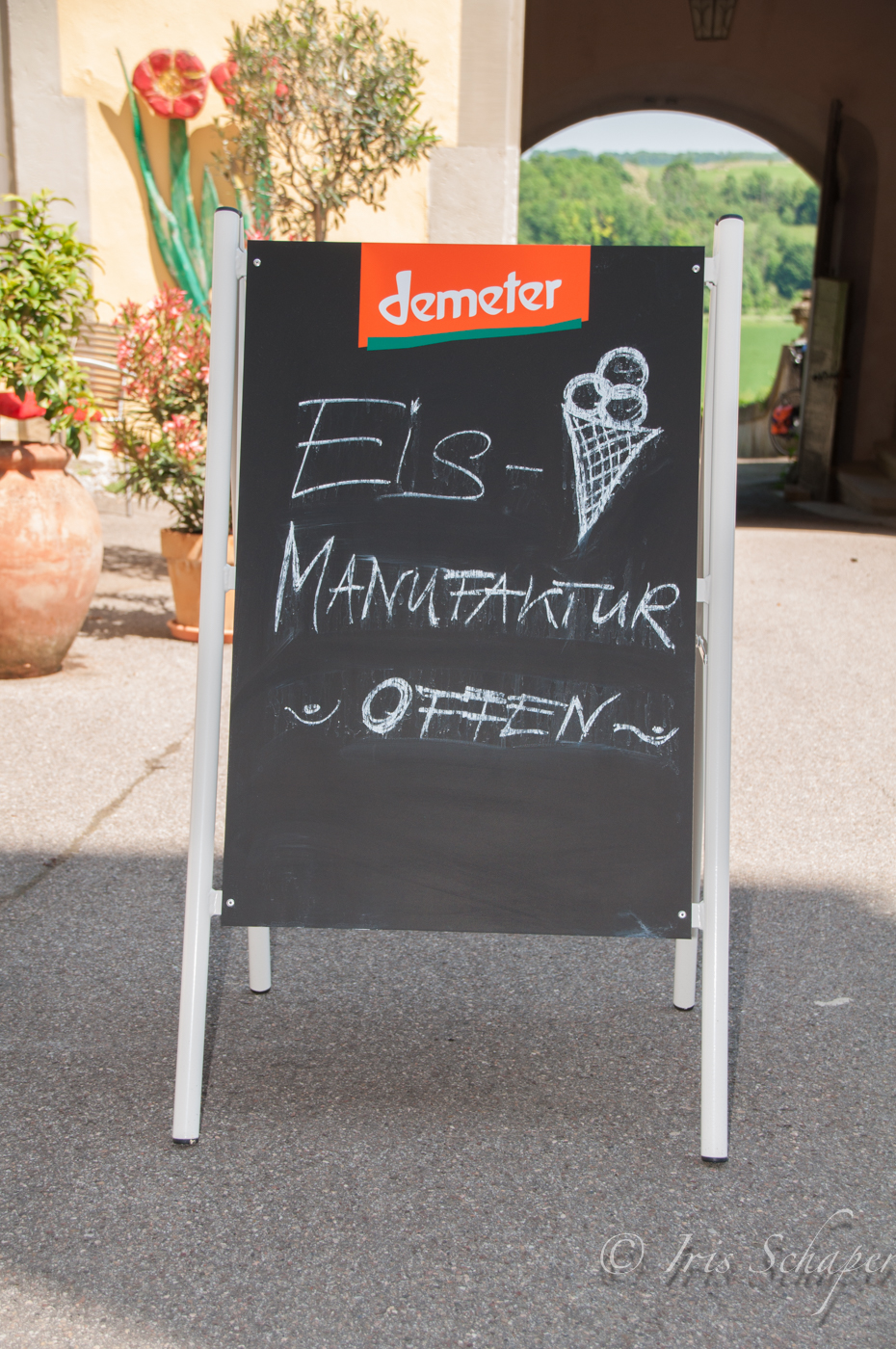 „Wir sind zudem die erste Manufaktur, die für Demeter-Heumilcheis zertifiziert ist.“ Heumilch, das ist übrigens Milch von Kühen, die im Sommer draußen leben, dort Gras und frische Kräuter von der Weide fressen und im Winter nur Heu und Getreideschrot – keine vergorenen Lebensmittel wie Silage oder gar industriell gefertigtes Tierfutter. Bei Demeter dürfen die Bio-Heumilch-Kühe zudem ihre Hörner behalten. Ihre Zulieferer kennen die beiden natürlich persönlich. Aber das ist ja auch irgendwie logisch, wenn man in einem Schloss wohnt, das Kleinbauern gehört.