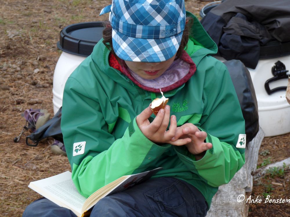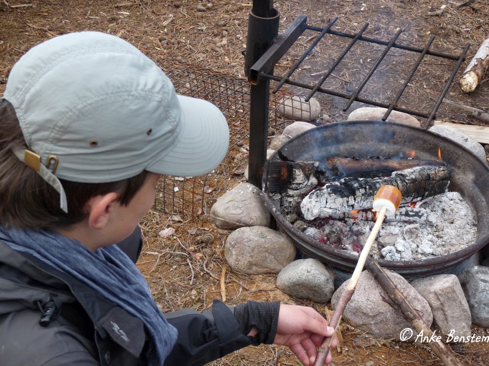 Schon bald werde ich mich nach der Stille zurücksehnen, wenn der Wind dunkle Wolken vor sich hertreibt und der Regen so gnadenlos herabprasselt, so dass wir, statt weiter zu paddeln, lieber einen Pausentag einlegen. Und so jetzt mit der ganzen Familie unter dem aus einer schlichten, scheußlich blauen Baumarktfolie gebastelten Tarp sitzen und Karten spielen. Oder im Unterstand aus Holz hocken und versuchen, das Feuer in Gang zu halten. Feuer und Wasser, hier gehören sie untrennbar zusammen. Tagsüber bestimmt das Wasser das Fortkommen, abends prasselt ein Lagerfeuer, hält uns warm und die Mücken einigermaßen fern. Denn die nerven echt. Die Kinder laufen ganzkörpervermummt durch den Wald, aber die Biester – allen voran die Knott, die kleinen, fiesen Gnitzen – finden trotzdem immer einen Weg, Blut saugen zu können. Wenn es juckt, können auch die gegrillten Marshmallows, die jeden Abend noch besser gelingen, nicht die Laune heben. Sonst aber schon.