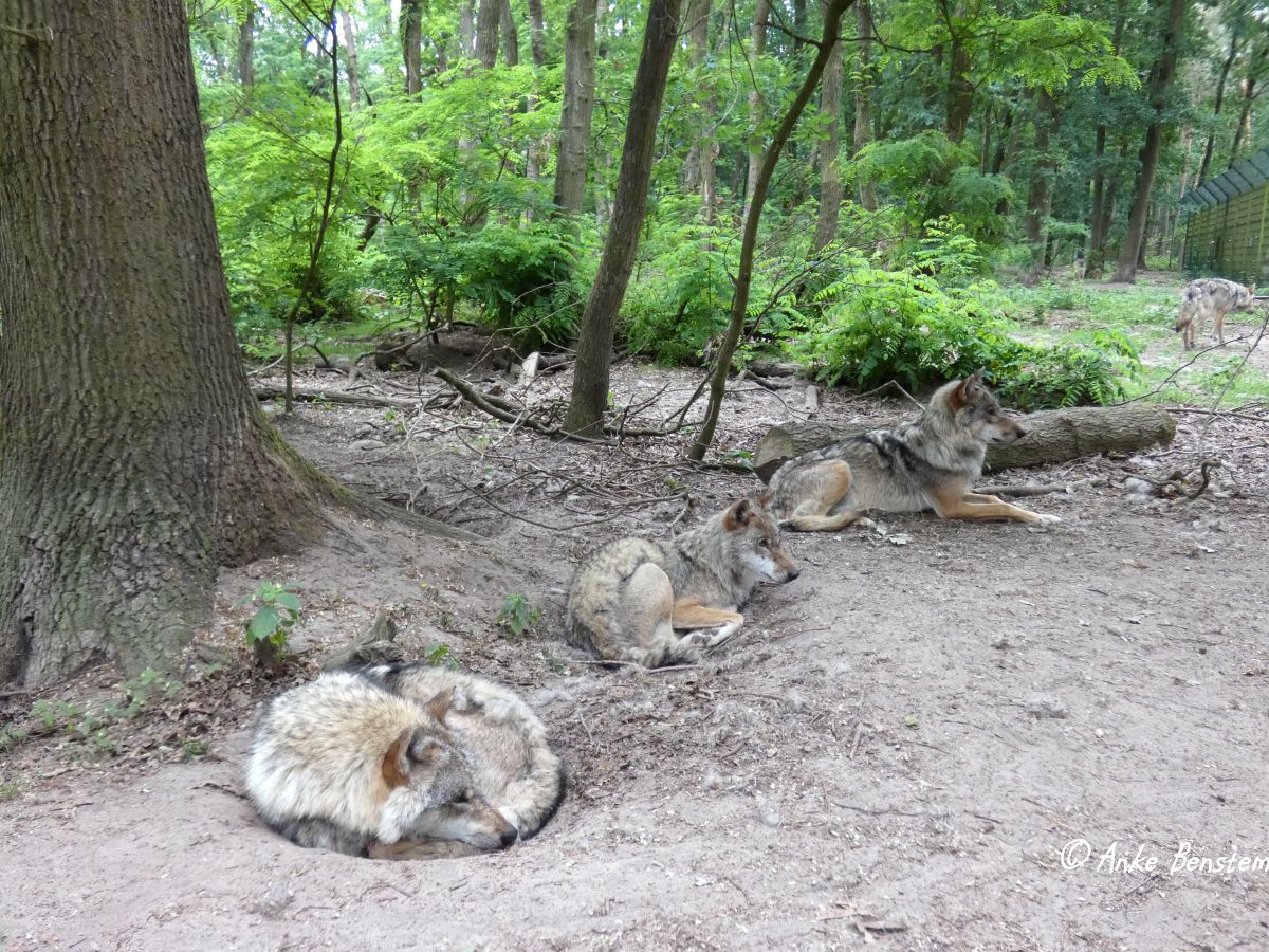 Und was machen die Wölfe so? Die meiste Zeit dösen sie in Erdkuhlen, eingerollt und die Nase tief ins Fell vergraben. Ab und zu spitzt einer die Ohren, steht auf, läuft herum. Später werden sie aktiv, drehen große Runden durchs Gehege. Sie scheinen zu wissen, wann Futterzeit ist. Insgesamt wirken die Wölfe zufrieden, aber ein wenig gelangweilt – was nicht wundert, schließlich haben sie hier Vollversorgung und müssen sich um ihr Fressen nicht selbst kümmern. So scheinen sie die meiste Zeit zu schlafen. Doch in der Dämmerung werden sie plötzlich richtig aktiv, laufen herum, sammeln sich, und dann beginnt der erste zu heulen. Die anderen fallen ein, mehrstimmig hallen ihre unterschiedlich hohen Stimmen durch den Wald. Aus dem anderen Gehege kommt umgehend Antwort – wie gern würde man wissen, was da gerade kommuniziert wird. Und das klingt dann so: