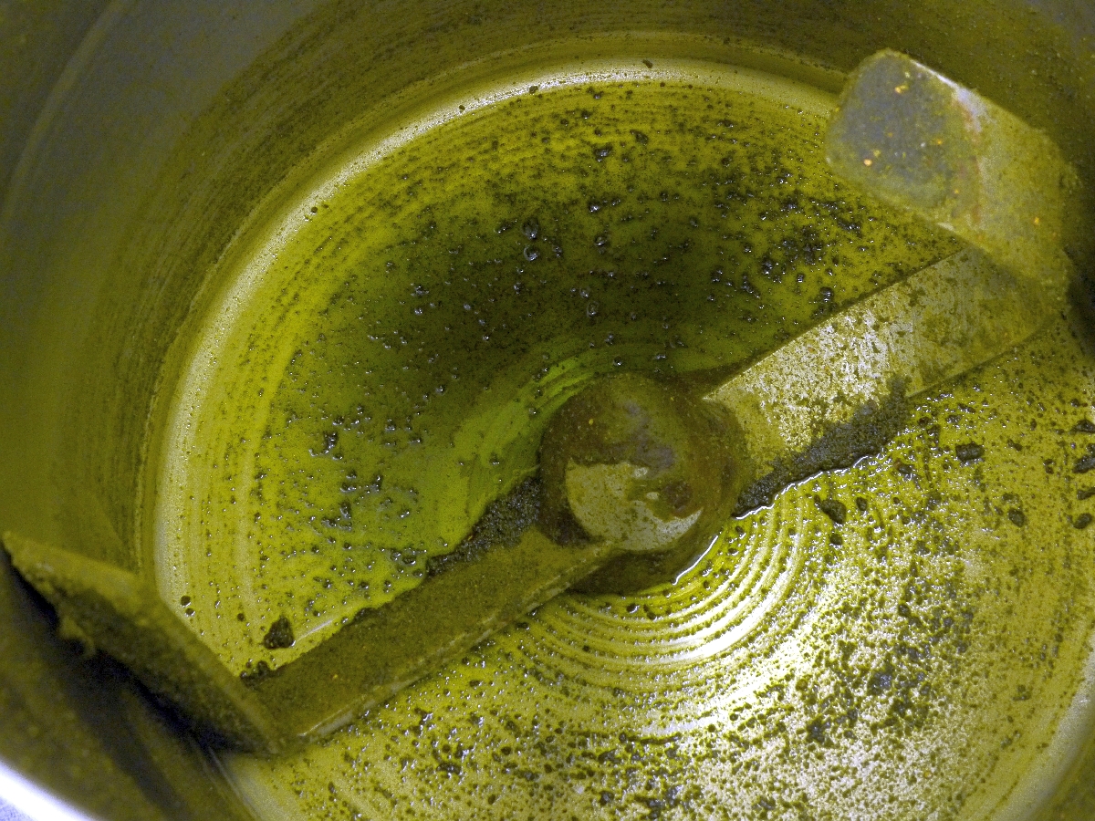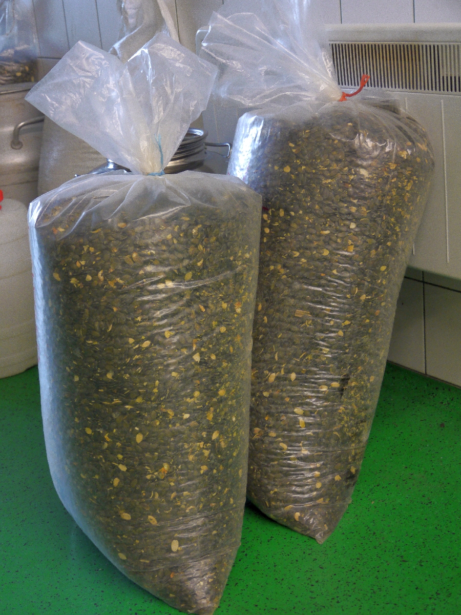 „Die grünen Kerne werden direkt getrocknet, sie müssen ja nicht geschält werden“, erklärt Liane Berghofer. „Und dann werden sie bei uns zum Brei zerkleinert, mit Salz geröstet und warm ausgepresst. Erst das Rösten sorgt für den nussigen Geschmack“. Und nur Öl der richtigen Kernsorte, in streng definierter Region angebaut und auch gepresst, dürfen die begehrte Banderole „Steirisches Kürbiskernöl g.g.A“ tragen.