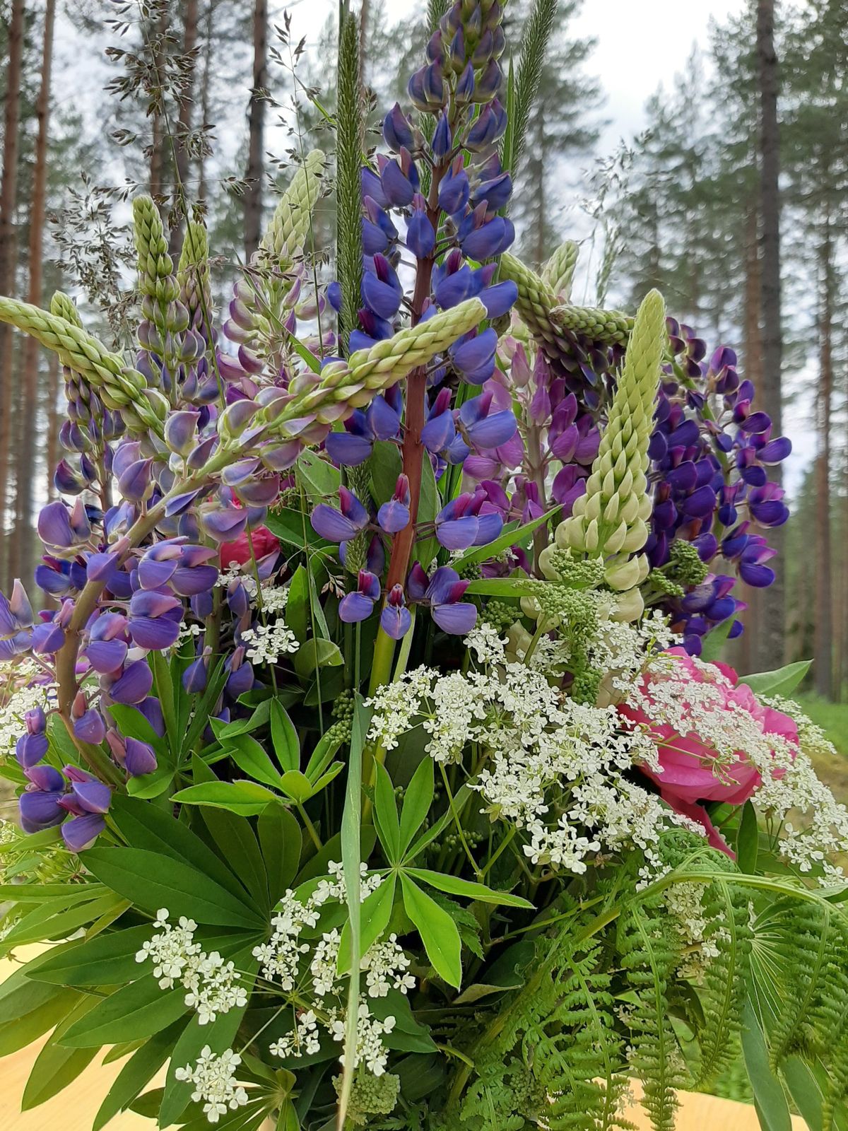 Vom Parkplatz (mit Plumpsklo als Basis-Infrastruktur) waren es keine zweihundert Meter Fußweg, schon standen wir vor dem Tisch. Der war heute schon gedeckt, in der Mitte eine Vase in der Mitte leuchteten üppige rosafarbene und violette Lupinen (die findet man im Sommer nicht nur in Värmland, sondern überall in Schweden an Straßenrändern und auf Freiflächen), auf den Bänken liegen Decken. Das mit den Blumen und Decken ist aber nicht immer so. Wer nur den Tisch bucht, muss selbst für Deko und Komfort sorgen. Gar kein Problem – überall wachsen ja Blätter, Moos, Flechten, liegen Zweige auf dem Boden. Kreative können sich also austoben.