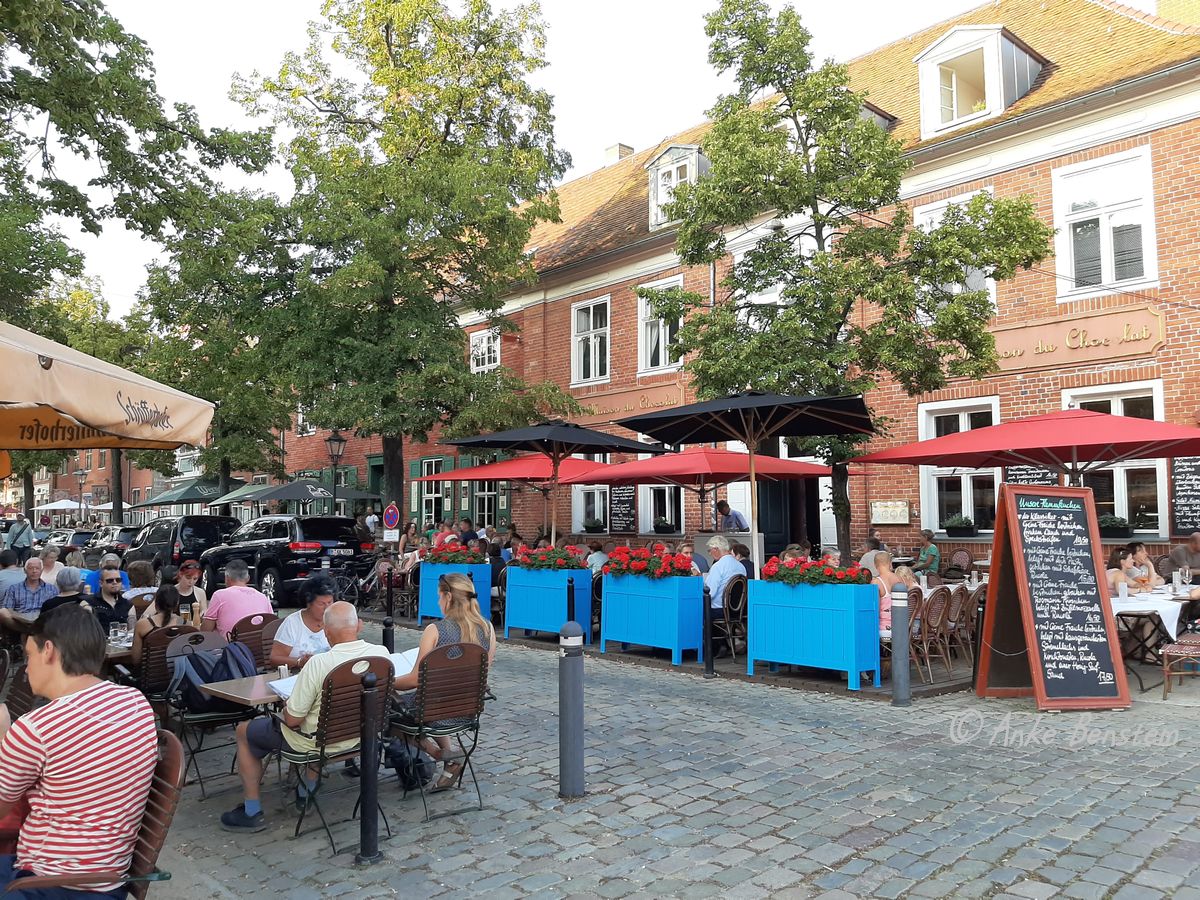 Im Neuen Garten liegt das Café Pandoras, angeschlossen an die Orangerie. Hier könnte das Motto lauten „schöner Kaffeetrinken“: Man sitzt auf den wenigen Außenplätzen zwischen hohen Säulen, flankiert von zwei ägyptischen Standbildern. Vorn blickt man auf ein holländisch aussehendes, sehr hübsches Backsteinhaus, gleich dahinter liegt der Heilige See… kann so bleiben. Im Sommer täglich 11-18 Uhr