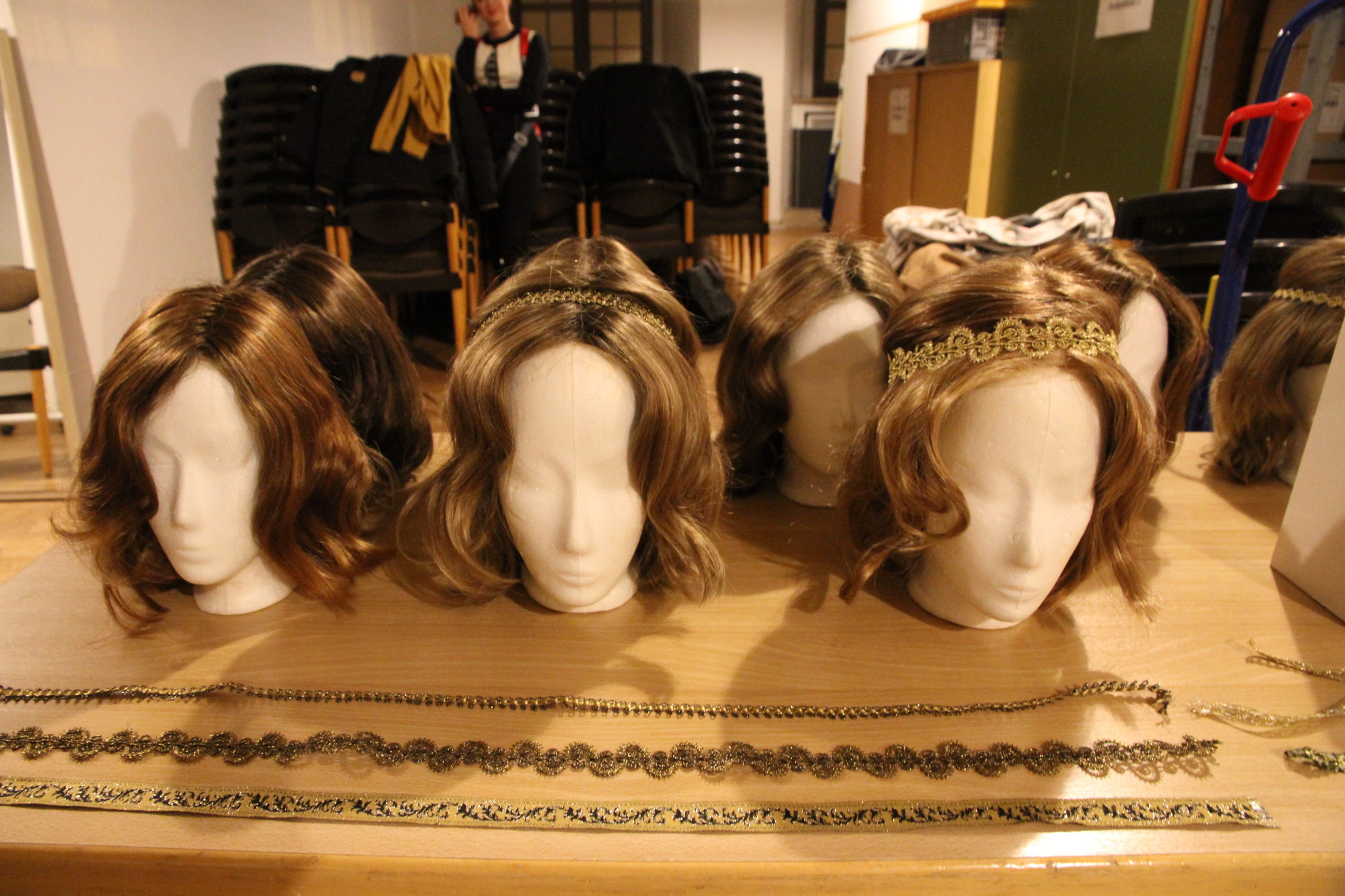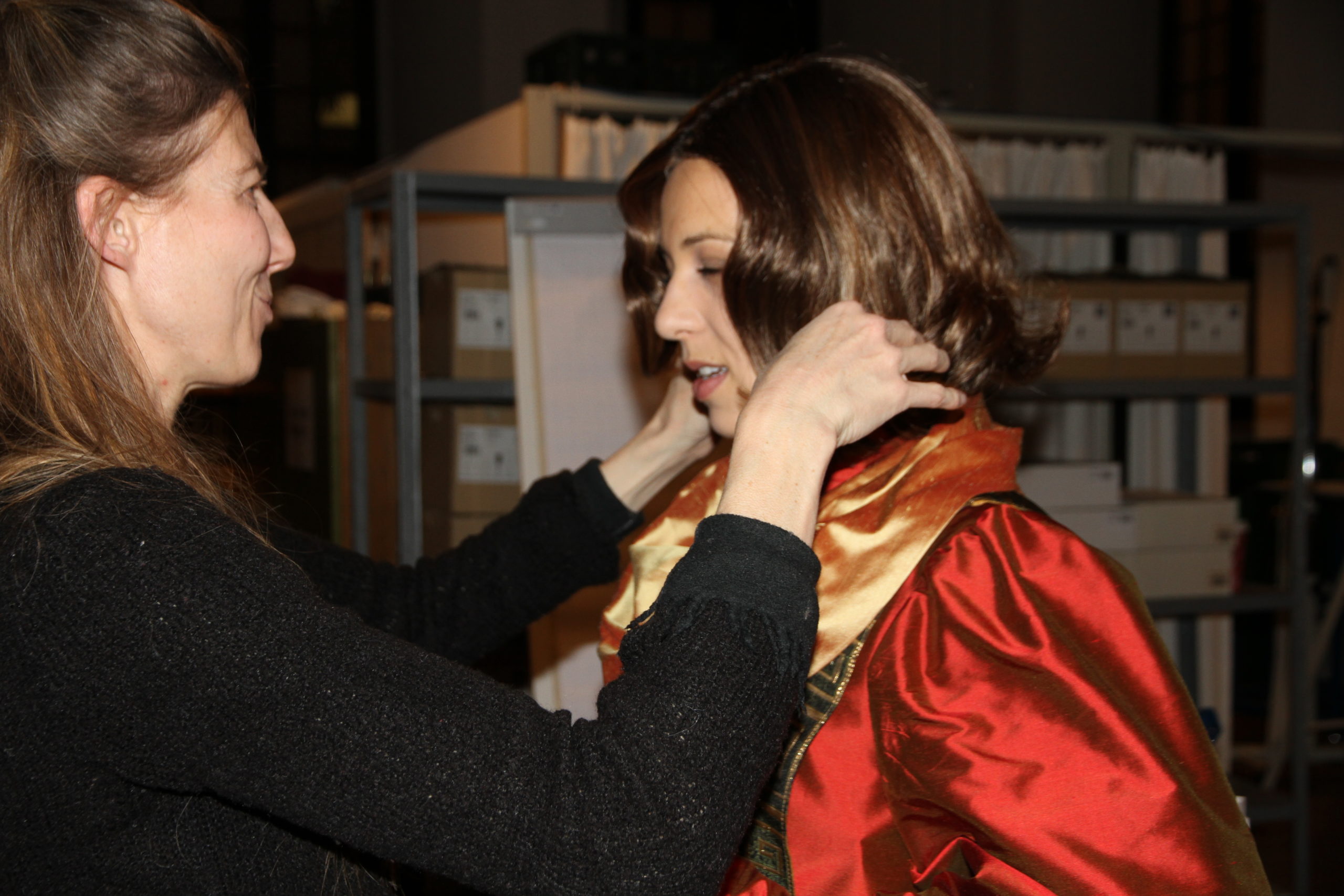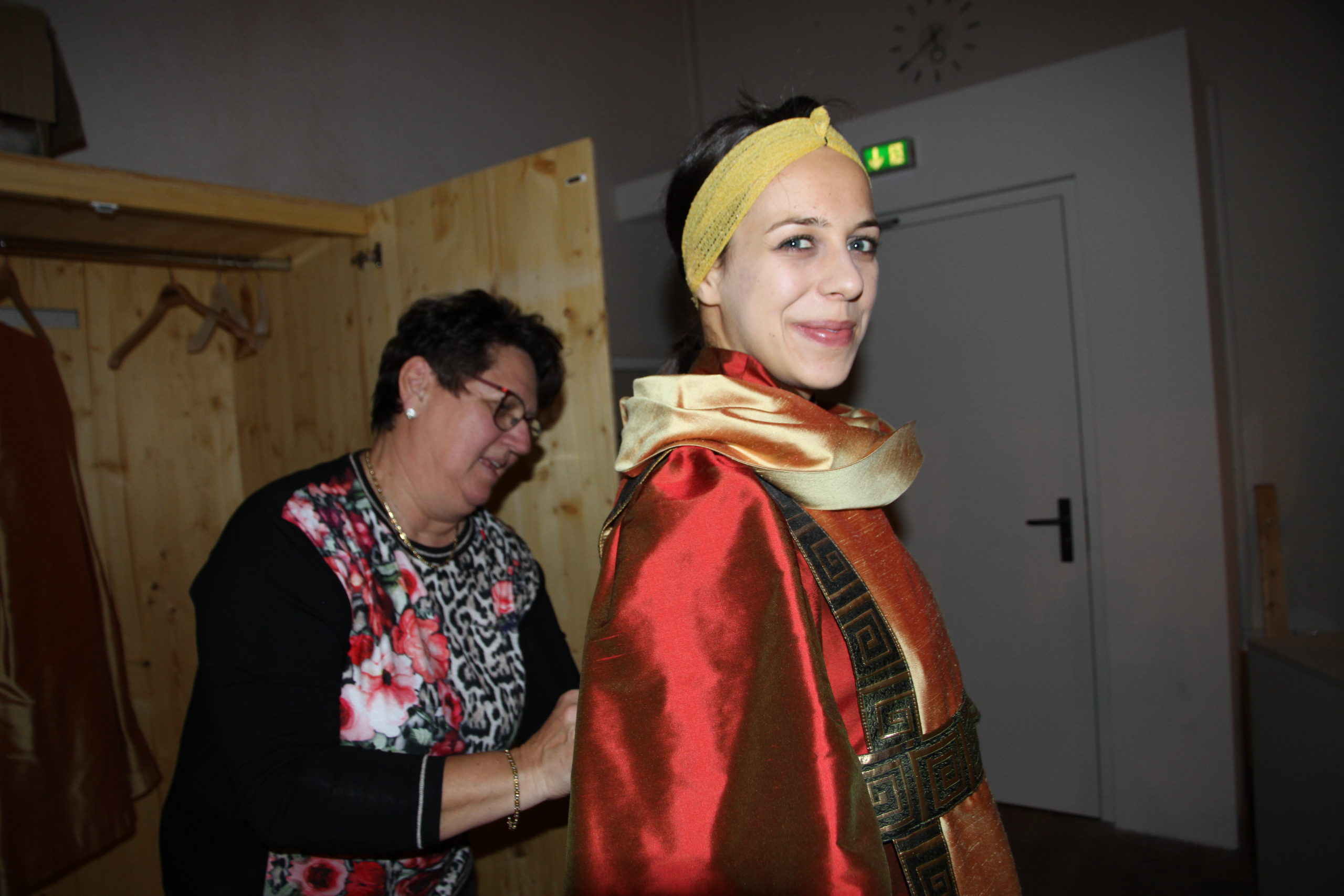 Juliana Kraus hat 2010 die künstlerische Leitung übernommen – natürlich selbst ewiger Engel. „Die meisten von uns kommen aus Augsburg und sind zwischen 4 und 40 Jahre alt.“ Die Älteren übernehmen die Rolle der Musizierenden und die Kinder stecken ihre kleinen Köpfe als putzige, barocke Putten mit weißen Federflügelchen aus den oberen Fenstern. „Oft waren schon die Mamas vor Jahren selbst Engel.“ Juliana packt kräftig mit an, auch ihre kleine Tochter spielt mit. Bis zur letzten Sekunde richtet sie die Kleider, bindet Haare zusammen, korrigiert Perücken. Und welche Voraussetzungen sollten die christlichen Darsteller mitbringen – außer schwindelfrei zu sein? „Ach sie sollten schon eine gewisse Haltung haben und die lernen sie meistens beim Ballett“, erklärt mir Juliana, die selbst eine Tanzausbildung hat. Himmelsboten wollen ja auch graziös aussehen und leicht wirken.
