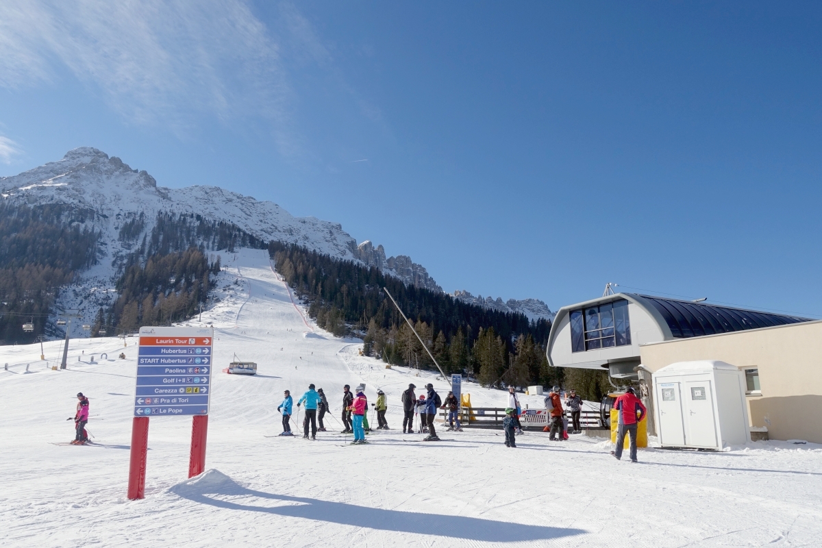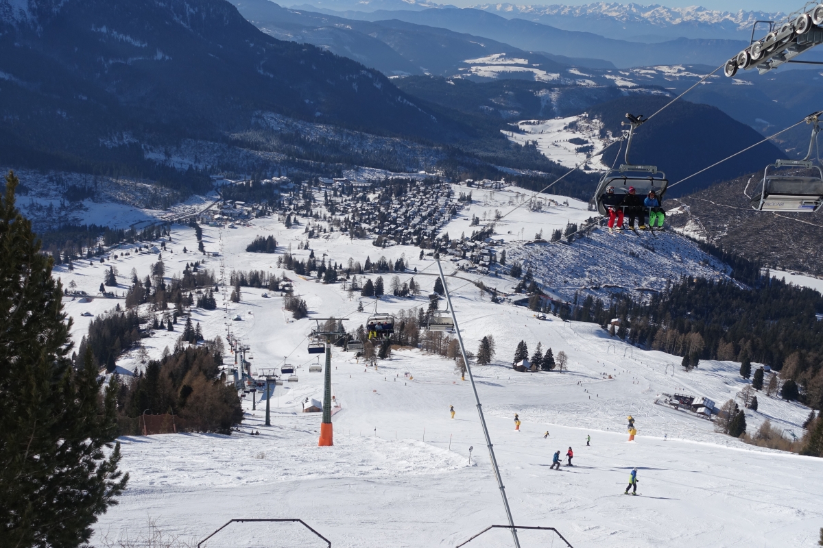 Carezza-Ski ist ein recht kleines Skigebiet, kaum schwarze Pisten, die meisten der 41 Abfahrten sind blau oder rot. Und als Skischaukel mit Schlepp- oder Sessel-Liften so miteinander verknüpft, dass man gut rumkommt am Tag. Von der Talstation Welschnofen auf 1343 Metern bis zum höchsten Punkt, der Kölner Hütte, knapp tausend Meter höher, mit dem Rosengarten-Felsmassiv im Rücken und Blick auf das Latemar-Massiv. Dazwischen liegen andere Pausenhütten, zwei Lernparks für kleine Brettl-Neulinge, gefühlt ewig lange Rodelbahnen und mehr.