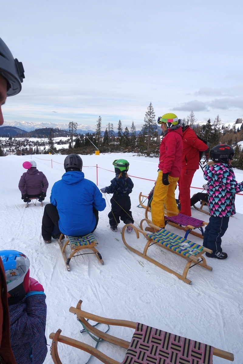 Verständlich, dass sich Carezza als Familienskigebiet positioniert. Und als möglichst umweltfreundlich, der Slogan lautet „So grün ist der Winter!“. Bis 2022 will man klimaneutral sein, als Teil eines Südtiroler Bündnisses. Schon seit einigen Jahren laufen die Schneekanonen und die Lifte mit Ökostrom, ein eigens eingerichtetes Speicherbecken sammelt das Wasser für den Kunstschnee. Mit kleinen Kindern brauchen wir aber doch wieder Bus oder Hoteltaxi, um zum Skikindergarten zu kommen, denn die Kurzen können noch nicht auf den Schlepplift.